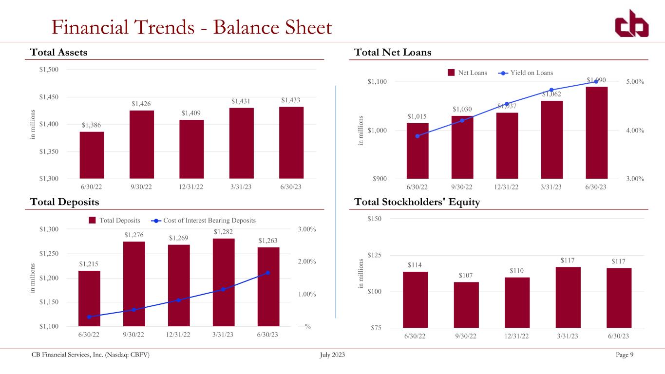 CB Financial Services, Inc. (Nasdaq: CBFV) July 2023 Page 8 Financial Highlights Change ($000s except per share) Q2 2023 Q1 2023 Q2 2022 Balance Sheet Total Loans (Net Allowance) $ 1,090,488 $ 28,893 $ 75,352 Total Deposits 1,263,315 (18,205) 48,125 Income Statement Net Interest Income 11,120 (463) 957 Provision for Credit Losses 432 352 (3,352) Noninterest Income (excl Net Gain (Loss) on Investment Securities) 2,369 (673) 65 Net Gain (Loss) on Investment Securities (100) 132 99 Noninterest Expense 9,501 473 1,091 Income Tax Expense 699 (430) 743 Net Income 2,757 (1,399) 2,639 Performance Ratios Earnings Per Share, Diluted $ 0.54 $ (0.27) $ 0.52 Net Interest Margin(1) 3.29 % (0.22) % 0.17 % ROAA(1) 0.79 % (0.42) % 0.76 % ROATCE(1)(2) 12.20 % (6.15) % 10.02 % NCOs/Average Loans(1) 0.04 % 0.33 % (0.97) % Tangible Book Value per Share(2) $ 20.39 $ (0.01) $ 0.96 Tangible Equity Ratio (TCE / TA)(2) 7.34 % (0.02) % 0.08 % Capital Ratios (Bank Only) Tier 1 Leverage 9.26 % 0.02 % 0.93 % Common Equity Tier 1 Capital 12.54 % (0.06) % 0.71 % Tier 1 Capital 12.54 % (0.06) % 0.71 % Total Risk-Based Capital 13.64 % (0.05) % 0.56 % Q2 2023 Results Overview (1) Annualized (2) Non-GAAP Calculation in Press Release (3) Comparisons are to Q1 2023 unless otherwise noted Quarterly Highlights(3) Balance Sheet: • Loans increased $28.9 million. • Deposits decreased $18.2 million. • Tangible book value per share (non-GAAP) was $20.39. Earnings and Capital: • Net income was $2.8 million and diluted EPS was $0.54. • Net interest margin(1) was down 22 bps to 3.29% resulting from increase in deposit costs. • Provision expense increased $352,000. Provision expense for Q2 2023 was driven primarily by loan growth while provision expense for Q1 2023 was positively impacted by a $750,000 recovery on a previously charged-off C&I loan. • Noninterest income declined primarily due to non-recurring BOLI claims recorded during Q1 2023. • Noninterest expense increased 5.2% due to costs associated with strategic staffing additions, technology investments (ITMs, website redesign) and branch improvements. • Effective Tax Rate was 20.2%. • Tier 1 Leverage ratio was 9.3%.