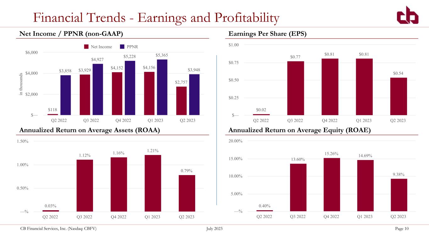 CB Financial Services, Inc. (Nasdaq: CBFV) July 2023 Page 9 Financial Trends - Balance Sheet Total Net LoansTotal Assets Total Deposits Total Stockholders' Equity in m ill io ns $1,386 $1,426 $1,409 $1,431 $1,433 6/30/22 9/30/22 12/31/22 3/31/23 6/30/23 $1,300 $1,350 $1,400 $1,450 $1,500 in m ill io ns $1,015 $1,030 $1,037 $1,062 $1,090 Net Loans Yield on Loans 6/30/22 9/30/22 12/31/22 3/31/23 6/30/23 $900 $1,000 $1,100 3.00% 4.00% 5.00% in m ill io ns $1,215 $1,276 $1,269 $1,282 $1,263 Total Deposits Cost of Interest Bearing Deposits 6/30/22 9/30/22 12/31/22 3/31/23 6/30/23 $1,100 $1,150 $1,200 $1,250 $1,300 —% 1.00% 2.00% 3.00% in m ill io ns $114 $107 $110 $117 $117 6/30/22 9/30/22 12/31/22 3/31/23 6/30/23 $75 $100 $125 $150