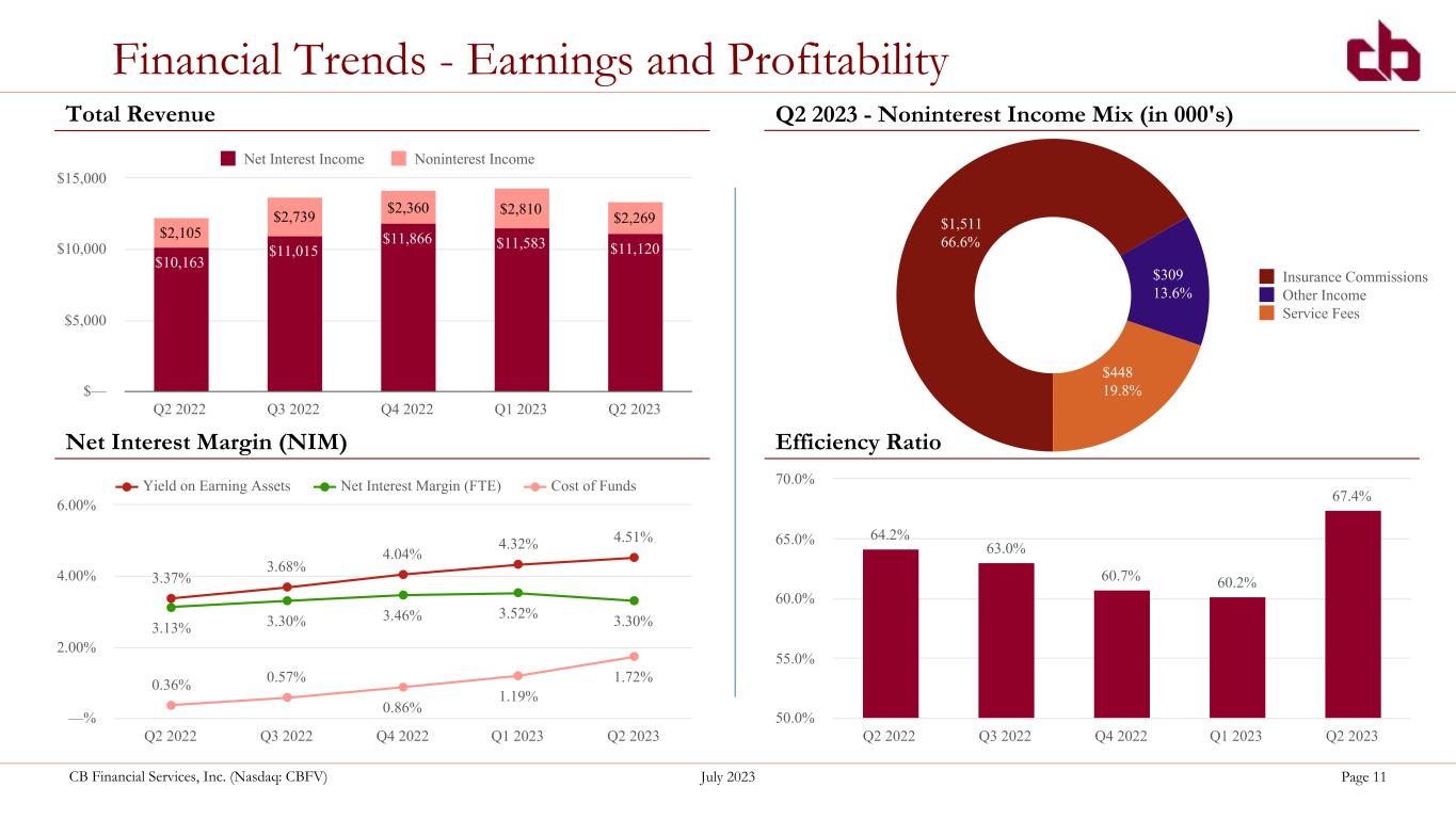 CB Financial Services, Inc. (Nasdaq: CBFV) July 2023 Page 10 Financial Trends - Earnings and Profitability Net Income / PPNR (non-GAAP) Earnings Per Share (EPS) in th ou sa nd s $118 $3,929 $4,152 $4,156 $2,757 $3,858 $4,927 $5,228 $5,365 $3,948 Net Income PPNR Q2 2022 Q3 2022 Q4 2022 Q1 2023 Q2 2023 $— $2,000 $4,000 $6,000 $0.02 $0.77 $0.81 $0.81 $0.54 Q2 2022 Q3 2022 Q4 2022 Q1 2023 Q2 2023 $— $0.25 $0.50 $0.75 $1.00 Annualized Return on Average Equity (ROAE) 0.40% 13.60% 15.26% 14.69% 9.38% Q2 2022 Q3 2022 Q4 2022 Q1 2023 Q2 2023 —% 5.00% 10.00% 15.00% 20.00% Annualized Return on Average Assets (ROAA) 0.03% 1.12% 1.16% 1.21% 0.79% Q2 2022 Q3 2022 Q4 2022 Q1 2023 Q2 2023 —% 0.50% 1.00% 1.50%