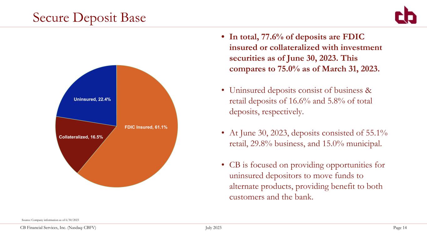 CB Financial Services, Inc. (Nasdaq: CBFV) July 2023 Page 13 Deposit Mix and Cost 25.0% 29.7% 14.7% 17.2% 13.4% Non-Interest Bearing Demand Interest Bearing Demand Money Market Accounts Savings Accounts Time Deposits As of 6/30/2023 Cost of Interest-Bearing Deposits 0.29% 0.51% 0.81% 1.14% 1.66% Q2 2022 Q3 2022 Q4 2022 Q1 2023 Q2 2023 —% 0.50% 1.00% 1.50% 2.00% Deposit Composition (in millions) 6/30/22 9/30/22 12/31/22 3/31/23 6/30/23 NIB Demand $ 389.1 $ 407.1 $ 390.4 $ 350.9 $ 316.1 IB Demand $ 265.3 $ 298.8 $ 311.8 $ 359.1 $ 374.7 Money Market $ 185.3 $ 198.7 $ 209.1 $ 206.2 $ 185.8 Savings Accounts $ 250.2 $ 250.4 $ 248.0 $ 234.9 $ 217.3 Time Deposits $ 125.2 $ 120.9 $ 109.1 $ 130.4 $ 169.5 Total Deposits $ 1,215.1 $ 1,275.9 $ 1,268.4 $ 1,281.5 $ 1,263.4 Highlights • Deposits decreased $5.2 million, or 0.4%, from December 31, 2022. • Mix shifting to higher-cost IB demand and time deposits. • Retaining deposits through certificate offering at a cost favorable to alternative funding sources. • Cost of interest bearing deposits was 1.66% for Q2 2023, compared to 1.14% for Q1 2023 and 0.29% for Q2 2022. Q2 2022 Q3 2022 Q4 2022 Q1 2023 Q2 2023 —% 0.50% 1.00% 1.50% 2.00% 2.50% 3.00% 3.50%