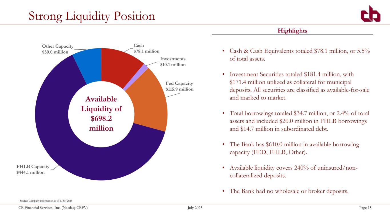 CB Financial Services, Inc. (Nasdaq: CBFV) July 2023 Page 14 Secure Deposit Base • In total, 77.6% of deposits are FDIC insured or collateralized with investment securities as of June 30, 2023. This compares to 75.0% as of March 31, 2023. • Uninsured deposits consist of business & retail deposits of 16.6% and 5.8% of total deposits, respectively. • At June 30, 2023, deposits consisted of 55.1% retail, 29.8% business, and 15.0% municipal. • CB is focused on providing opportunities for uninsured depositors to move funds to alternate products, providing benefit to both customers and the bank. FDIC Insured, 61.1% Collateralized, 16.5% Uninsured, 22.4% Source: Company information as of 6/30/2023