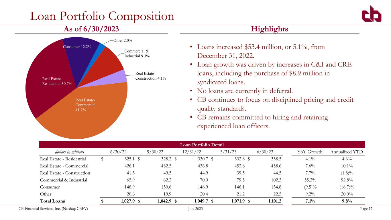 CB Financial Services, Inc. (Nasdaq: CBFV) July 2023 Page 17 Loan Portfolio Composition Commercial & Industrial 9.3% Real Estate- Construction 4.1% Real Estate- Commercial 41.7% Real Estate- Residential 30.7% Consumer 12.2% Other 2.0% As of 6/30/2023 Loan Portfolio Detail dollars in millions 6/30/22 9/30/22 12/31/22 3/31/23 6/30/23 YoY Growth Annualized YTD Real Estate - Residential $ 325.1 $ 328.2 $ 330.7 $ 332.8 $ 338.5 4.1% 4.6% Real Estate - Commercial 426.1 432.5 436.8 452.8 458.6 7.6% 10.1% Real Estate - Construction 41.3 49.5 44.9 39.5 44.5 7.7% (1.8)% Commercial & Industrial 65.9 62.2 70.0 79.5 102.3 55.2% 92.8% Consumer 148.9 150.6 146.9 146.1 134.8 (9.5)% (16.7)% Other 20.6 19.9 20.4 21.2 22.5 9.2% 20.0% Total Loans $ 1,027.9 $ 1,042.9 $ 1,049.7 $ 1,071.9 $ 1,101.2 7.1% 9.8% Highlights • Loans increased $53.4 million, or 5.1%, from December 31, 2022. • Loan growth was driven by increases in C&I and CRE loans, including the purchase of $8.9 million in syndicated loans. • No loans are currently in deferral. • CB continues to focus on disciplined pricing and credit quality standards. • CB remains committed to hiring and retaining experienced loan officers.