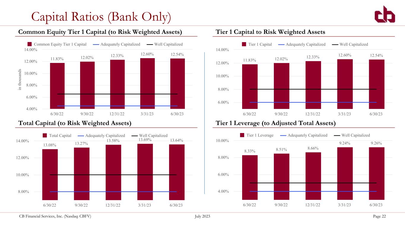 CB Financial Services, Inc. (Nasdaq: CBFV) July 2023 Page 22 Capital Ratios (Bank Only) Common Equity Tier 1 Capital (to Risk Weighted Assets) Tier 1 Capital to Risk Weighted Assets in th ou sa nd s 11.83% 12.02% 12.33% 12.60% 12.54% Common Equity Tier 1 Capital Adequately Capitalized Well Capitalized 6/30/22 9/30/22 12/31/22 3/31/23 6/30/23 4.00% 6.00% 8.00% 10.00% 12.00% 14.00% 11.83% 12.02% 12.33% 12.60% 12.54% Tier 1 Capital Adequately Capitalized Well Capitalized 6/30/22 9/30/22 12/31/22 3/31/23 6/30/23 6.00% 8.00% 10.00% 12.00% 14.00% Tier 1 Leverage (to Adjusted Total Assets) 8.33% 8.51% 8.66% 9.24% 9.26% Tier 1 Leverage Adequately Capitalized Well Capitalized 6/30/22 9/30/22 12/31/22 3/31/23 6/30/23 4.00% 6.00% 8.00% 10.00% Total Capital (to Risk Weighted Assets) 13.08% 13.27% 13.58% 13.69% 13.64% Total Capital Adequately Capitalized Well Capitalized 6/30/22 9/30/22 12/31/22 3/31/23 6/30/23 8.00% 10.00% 12.00% 14.00%