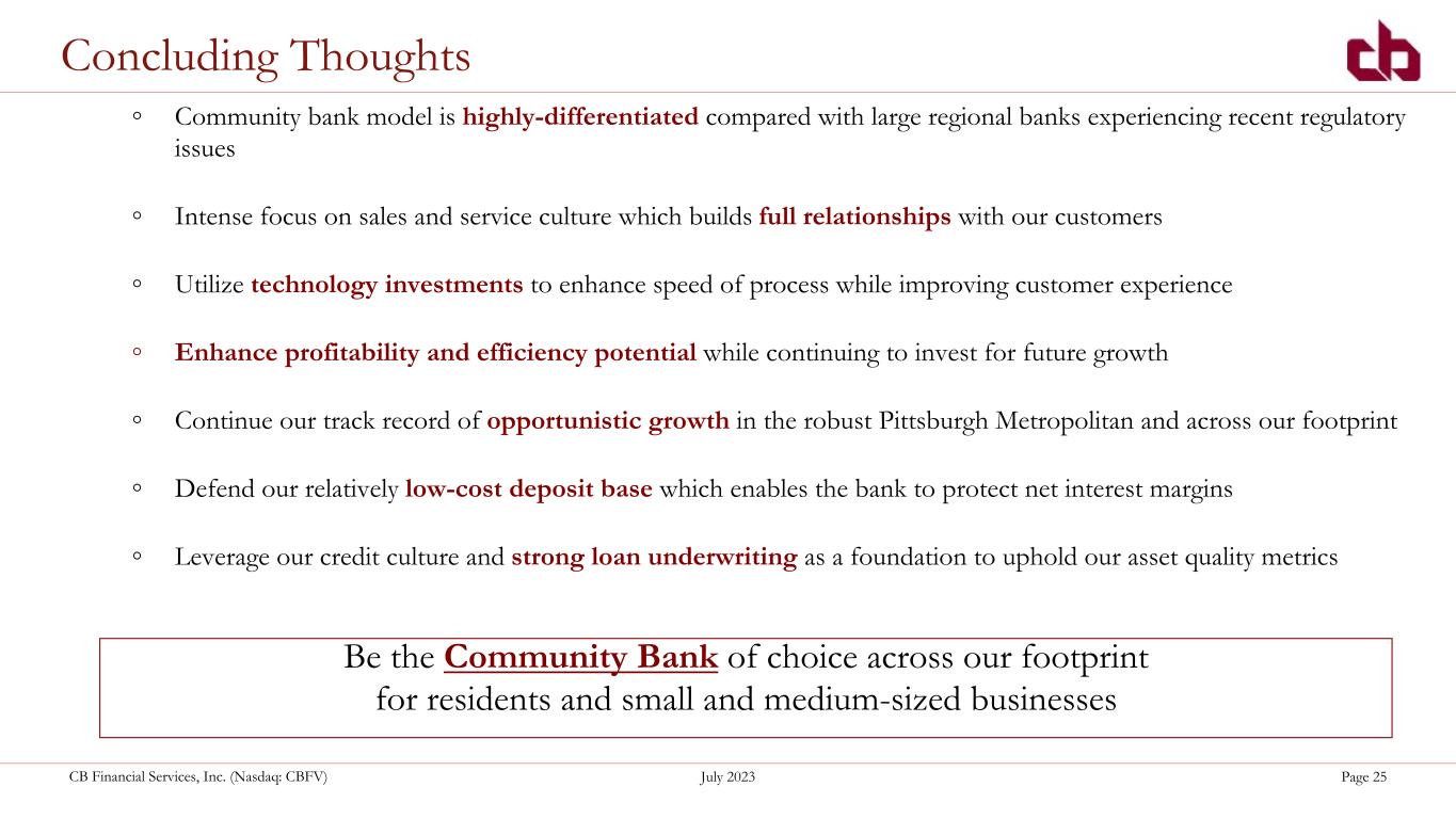 CB Financial Services, Inc. (Nasdaq: CBFV) July 2023 Page 24 Market Presence with Brand Recognition Seasoned Executive Leadership Deploying Technology to Enhance Client Experience Investment Summary Serving Stable Southwestern PA & Ohio River Valley markets Proven experience through all economic cycles Continuing to invest with a tech- forward and people-centric approach Investing for Growth Adding new talent, tech upgrades and investing in process improvement Rewarding Shareholders Stable quarterly dividend