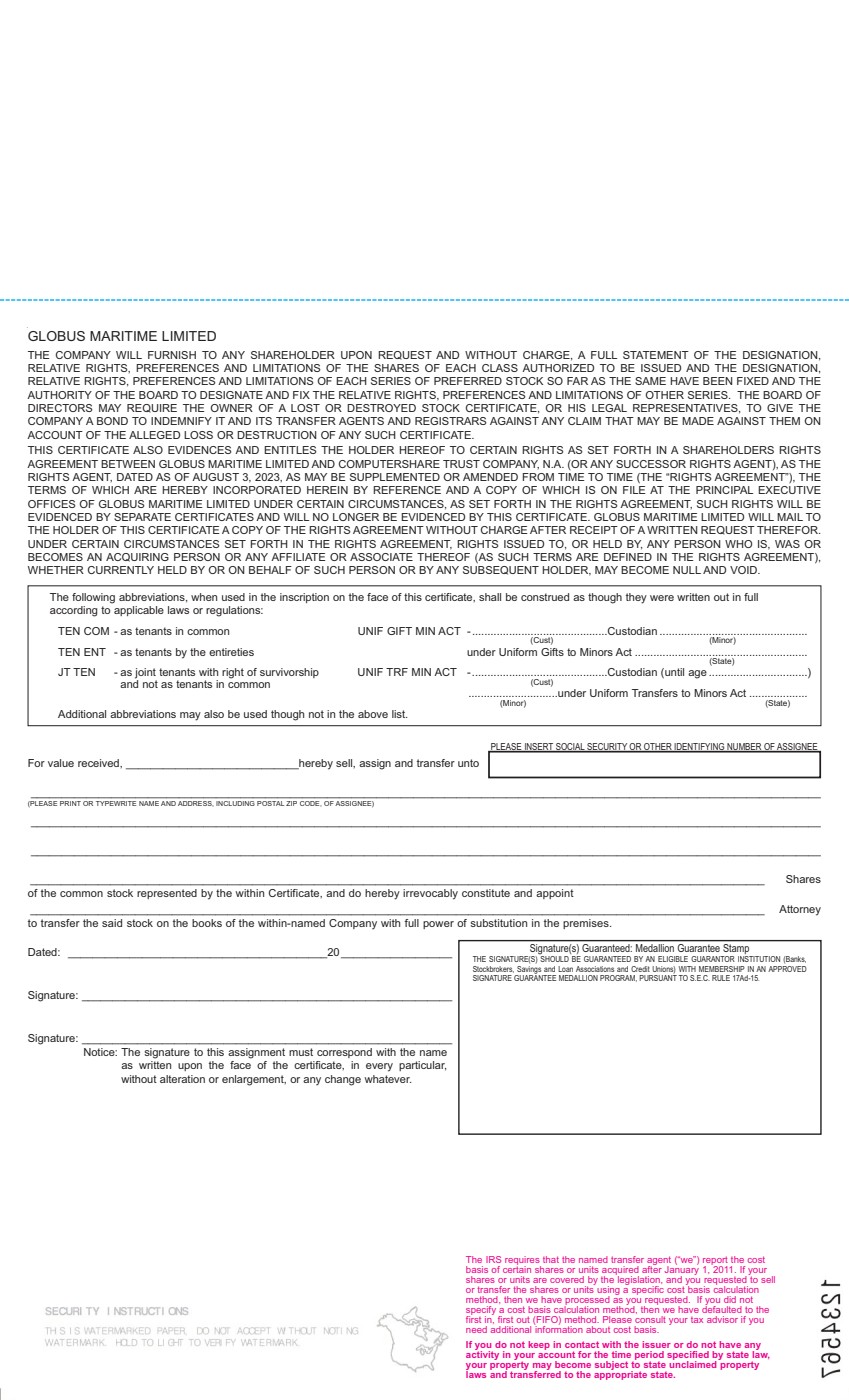 This Form 6-K is furnished by Globus Maritime Limited (the “Company” or “our” or “us” or “we”) in connection with entry into a Shareholders Rights Agreement dated as of August 3, 2023, between the Company and Computershare Trust Company, N.A., as rights agent.