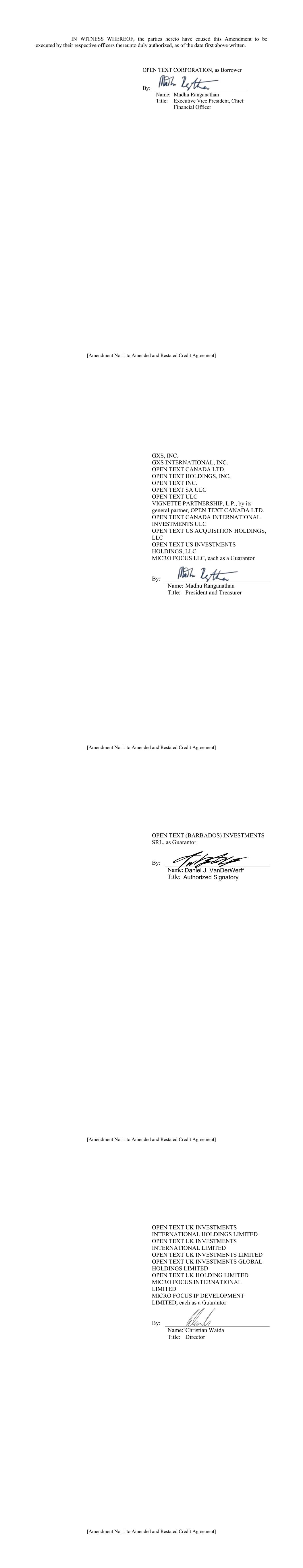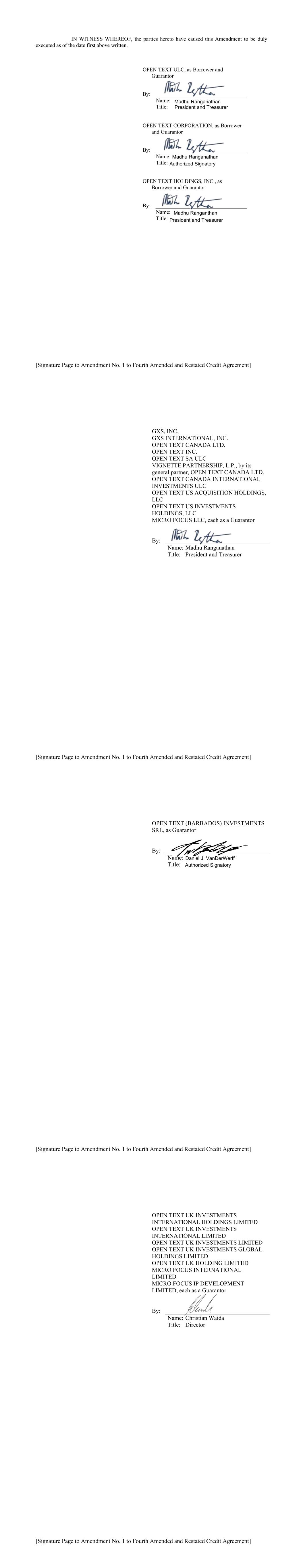 In connection with the Annual Report on Form 10-K of Open Text Corporation (the “Company”) for the year ended June 30, 2023 as filed with the Securities and Exchange Commission (the “Report”), I, Mark J. Barrenechea, Vice Chair, Chief Executive Officer and Chief Technology Officer of the Company, certify, as of the date hereof, pursuant to 18 U.S.C. Section 1350, as adopted pursuant to Section 906 of the Sarbanes-Oxley Act of 2002, that: