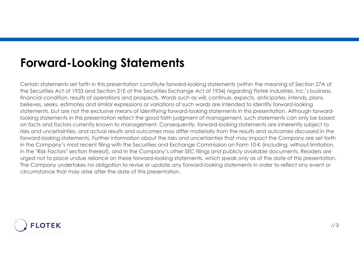 Forward-Looking Statements Certain statements set forth in this presentation constitute forward-looking statements (within the meaning of Section 27A of the Securities Act of 1933 and Section 21E of the Securities Exchange Act of 1934) regarding Flotek Industries, Inc.’s business, financial condition, results of operations and prospects. Words such as will, continue, expects, anticipates, intends, plans, believes, seeks, estimates and similar expressions or variations of such words are intended to identify forward-looking statements, but are not the exclusive means of identifying forward-looking statements in this presentation. Although forward- looking statements in this presentation reflect the good faith judgment of management, such statements can only be based on facts and factors currently known to management. Consequently, forward-looking statements are inherently subject to risks and uncertainties, and actual results and outcomes may differ materially from the results and outcomes discussed in the forward-looking statements. Further information about the risks and uncertainties that may impact the Company are set forth in the Company’s most recent filing with the Securities and Exchange Commission on Form 10-K (including, without limitation, in the "Risk Factors" section thereof), and in the Company’s other SEC filings and publicly available documents. Readers are urged not to place undue reliance on these forward-looking statements, which speak only as of the date of this presentation. The Company undertakes no obligation to revise or update any forward-looking statements in order to reflect any event or circumstance that may arise after the date of this presentation. // 2
