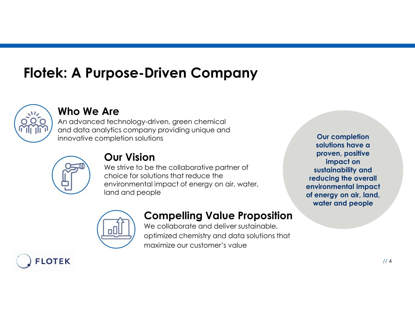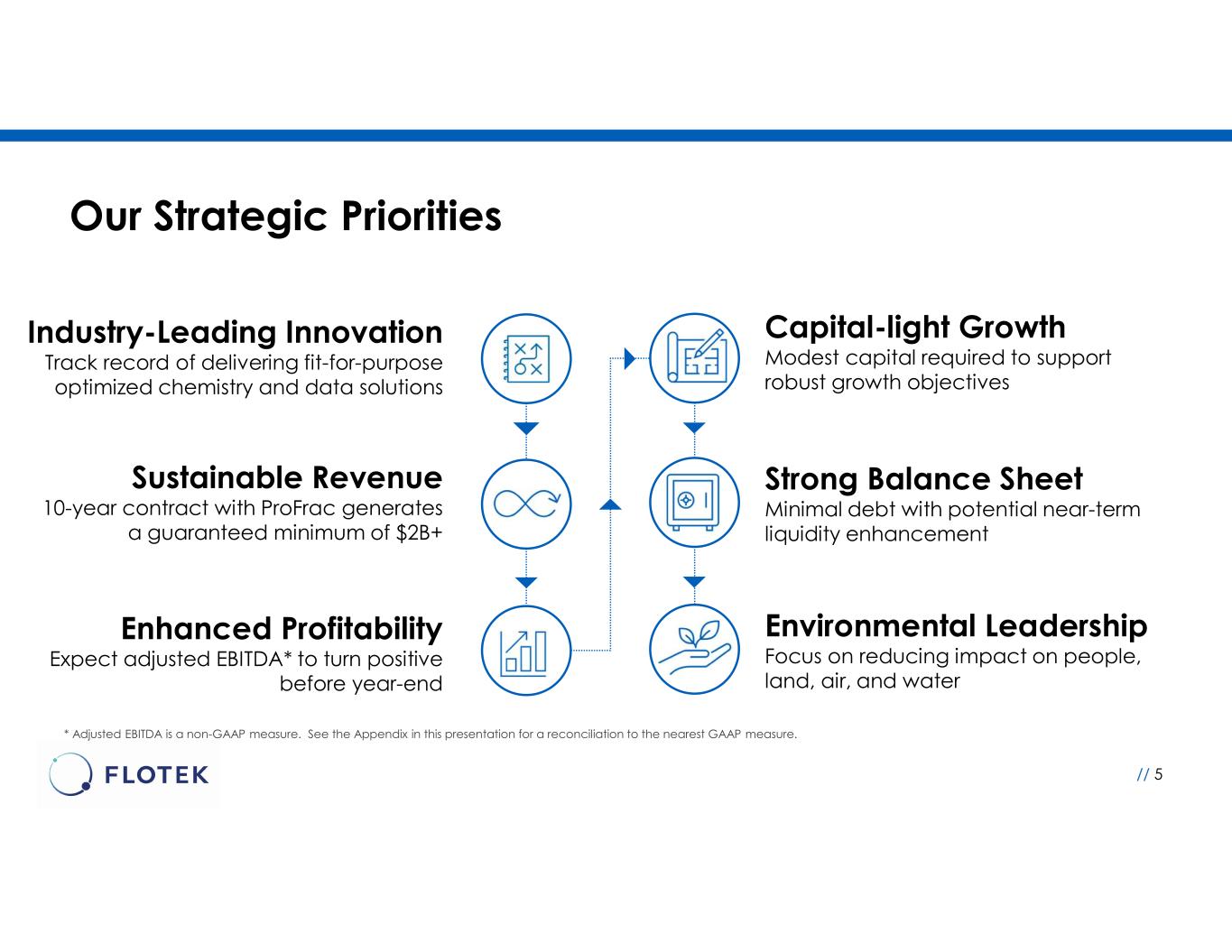 Flotek: A Purpose-Driven Company // 4 Our completion solutions have a proven, positive impact on sustainability and reducing the overall environmental impact of energy on air, land, water and people Who We Are An advanced technology-driven, green chemical and data analytics company providing unique and innovative completion solutions Our Vision We strive to be the collaborative partner of choice for solutions that reduce the environmental impact of energy on air, water, land and people Compelling Value Proposition We collaborate and deliver sustainable, optimized chemistry and data solutions that maximize our customer’s value