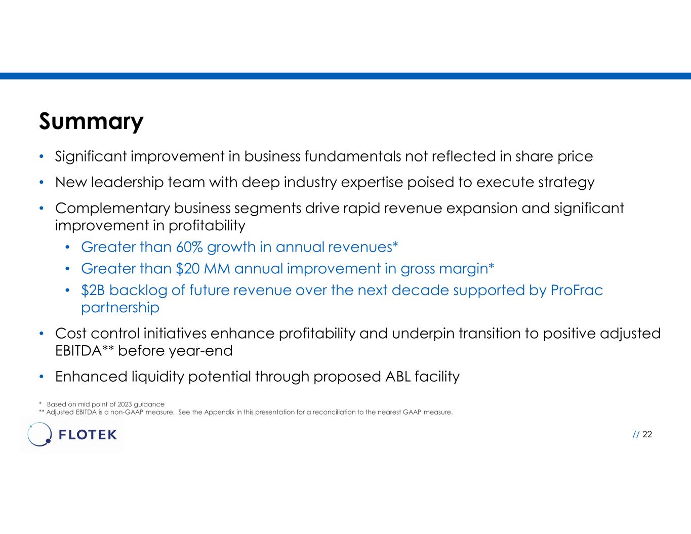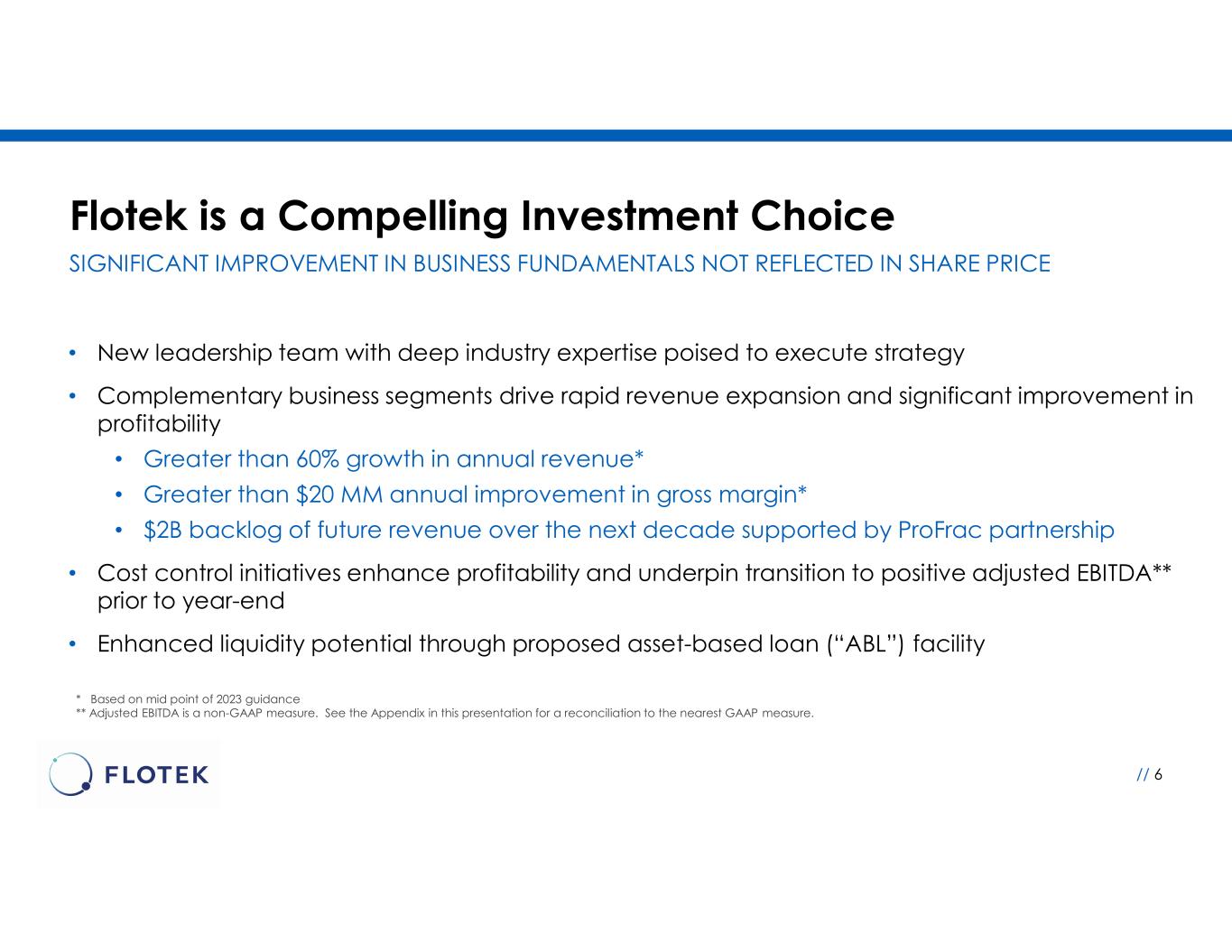 Flotek is a Compelling Investment Choice // 6 • New leadership team with deep industry expertise poised to execute strategy • Complementary business segments drive rapid revenue expansion and significant improvement in profitability • Greater than 60% growth in annual revenue* • Greater than $20 MM annual improvement in gross margin* • $2B backlog of future revenue over the next decade supported by ProFrac partnership • Cost control initiatives enhance profitability and underpin transition to positive adjusted EBITDA** prior to year-end • Enhanced liquidity potential through proposed asset-based loan (“ABL”) facility * Based on mid point of 2023 guidance ** Adjusted EBITDA is a non-GAAP measure. See the Appendix in this presentation for a reconciliation to the nearest GAAP measure. SIGNIFICANT IMPROVEMENT IN BUSINESS FUNDAMENTALS NOT REFLECTED IN SHARE PRICE