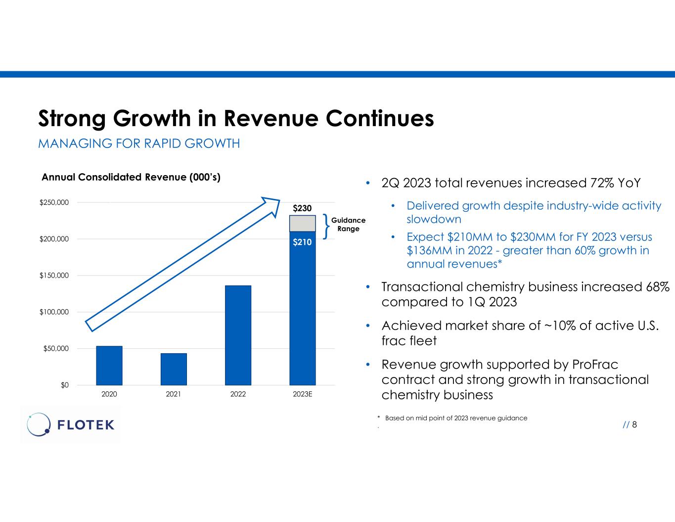 •Achieved strong growth in total revenues of 72% from the second quarter of 2022, resulting from Flotek’s strategic 10-year supply agreement with ProFrac Holdings, LLC (“ProFrac”). Second quarter of 2023 total revenues increased 5% sequentially despite an industry-wide slowdown in upstream activity and benefited from a 68% increase in transactional (non-ProFrac) chemistry business compared to the first quarter of 2023.