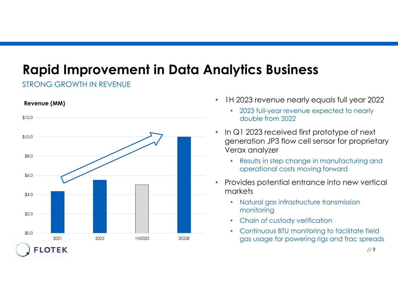 $0 $50,000 $100,000 $150,000 $200,000 $250,000 2020 2021 2022 2023E Strong Growth in Revenue Continues MANAGING FOR RAPID GROWTH // 8 • 2Q 2023 total revenues increased 72% YoY • Delivered growth despite industry-wide activity slowdown • Expect $210MM to $230MM for FY 2023 versus $136MM in 2022 - greater than 60% growth in annual revenues* • Transactional chemistry business increased 68% compared to 1Q 2023 • Achieved market share of ~10% of active U.S. frac fleet • Revenue growth supported by ProFrac contract and strong growth in transactional chemistry business Annual Consolidated Revenue (000’s) $210 $230 }Guidance Range * Based on mid point of 2023 revenue guidance .