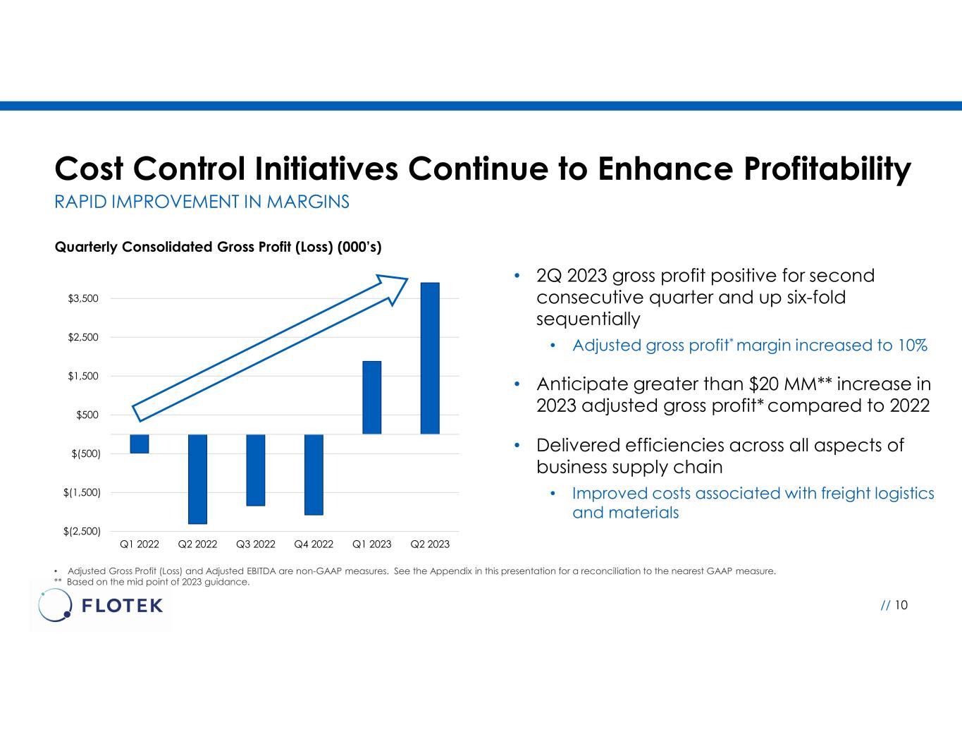 •Adjusted Gross Profit (Loss) (Non-GAAP)(1): Flotek generated adjusted gross profit of $5.1 million during the second quarter of 2023 compared to adjusted gross loss of $1.6 million for the second quarter of 2022 and gross profit of $2.6 million for the first quarter of 2023. Adjusted gross profit (loss) primarily excludes non-cash items, including amortization of contract assets, which reduces both revenue and gross profit.