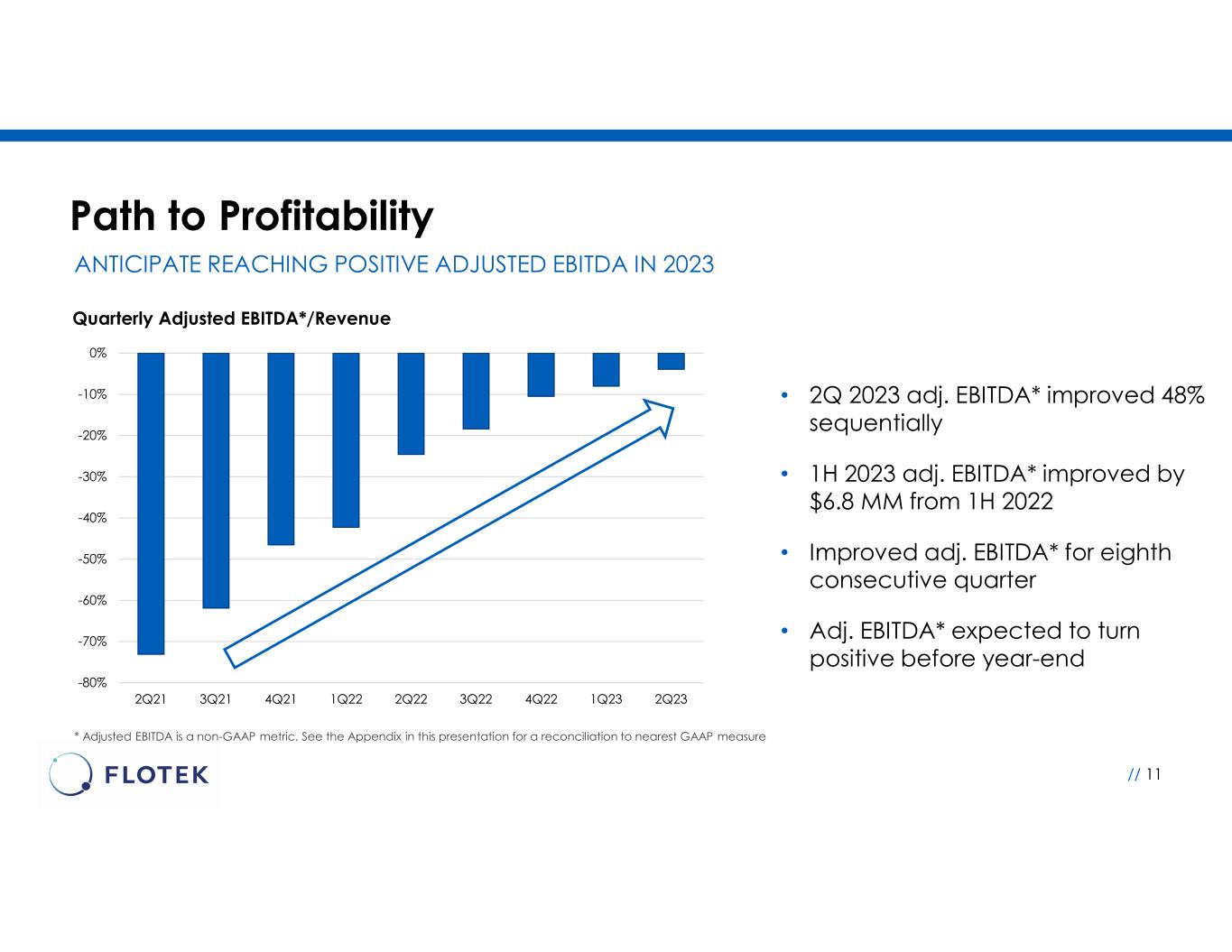 Cost Control Initiatives Continue to Enhance Profitability RAPID IMPROVEMENT IN MARGINS Quarterly Consolidated Gross Profit (Loss) (000’s) // 10 • 2Q 2023 gross profit positive for second consecutive quarter and up six-fold sequentially • Adjusted gross profit* margin increased to 10% • Anticipate greater than $20 MM** increase in 2023 adjusted gross profit* compared to 2022 • Delivered efficiencies across all aspects of business supply chain • Improved costs associated with freight logistics and materials $(2,500) $(1,500) $(500) $500 $1,500 $2,500 $3,500 Q1 2022 Q2 2022 Q3 2022 Q4 2022 Q1 2023 Q2 2023 • Adjusted Gross Profit (Loss) and Adjusted EBITDA are non-GAAP measures. See the Appendix in this presentation for a reconciliation to the nearest GAAP measure. ** Based on the mid point of 2023 guidance.