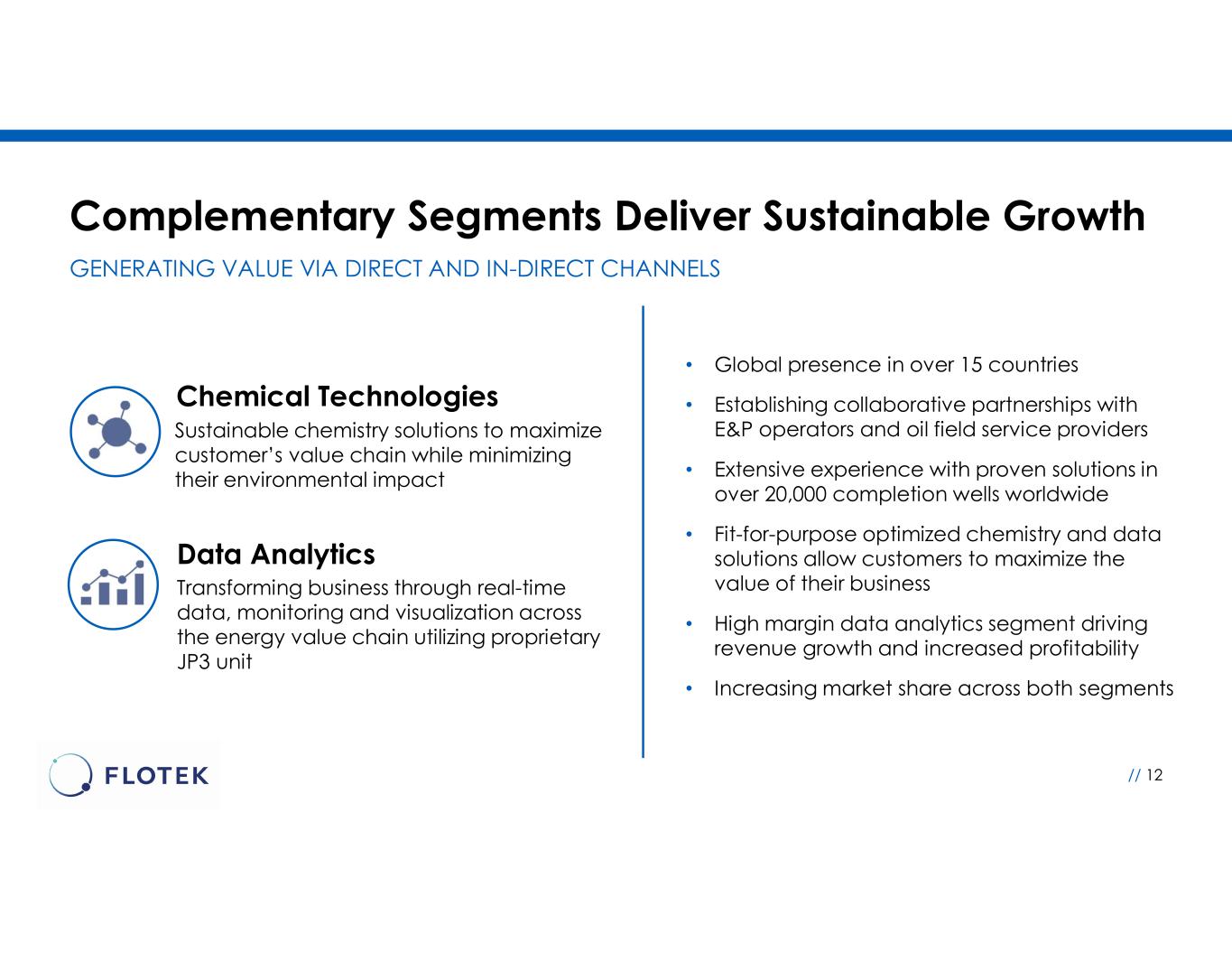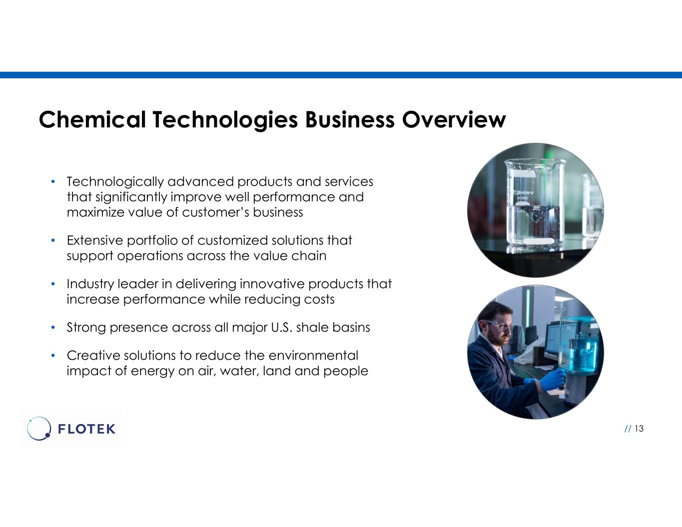 • Global presence in over 15 countries • Establishing collaborative partnerships with E&P operators and oil field service providers • Extensive experience with proven solutions in over 20,000 completion wells worldwide • Fit-for-purpose optimized chemistry and data solutions allow customers to maximize the value of their business • High margin data analytics segment driving revenue growth and increased profitability • Increasing market share across both segments Complementary Segments Deliver Sustainable Growth Sustainable chemistry solutions to maximize customer’s value chain while minimizing their environmental impact Transforming business through real-time data, monitoring and visualization across the energy value chain utilizing proprietary JP3 unit Chemical Technologies Data Analytics // 12 GENERATING VALUE VIA DIRECT AND IN-DIRECT CHANNELS