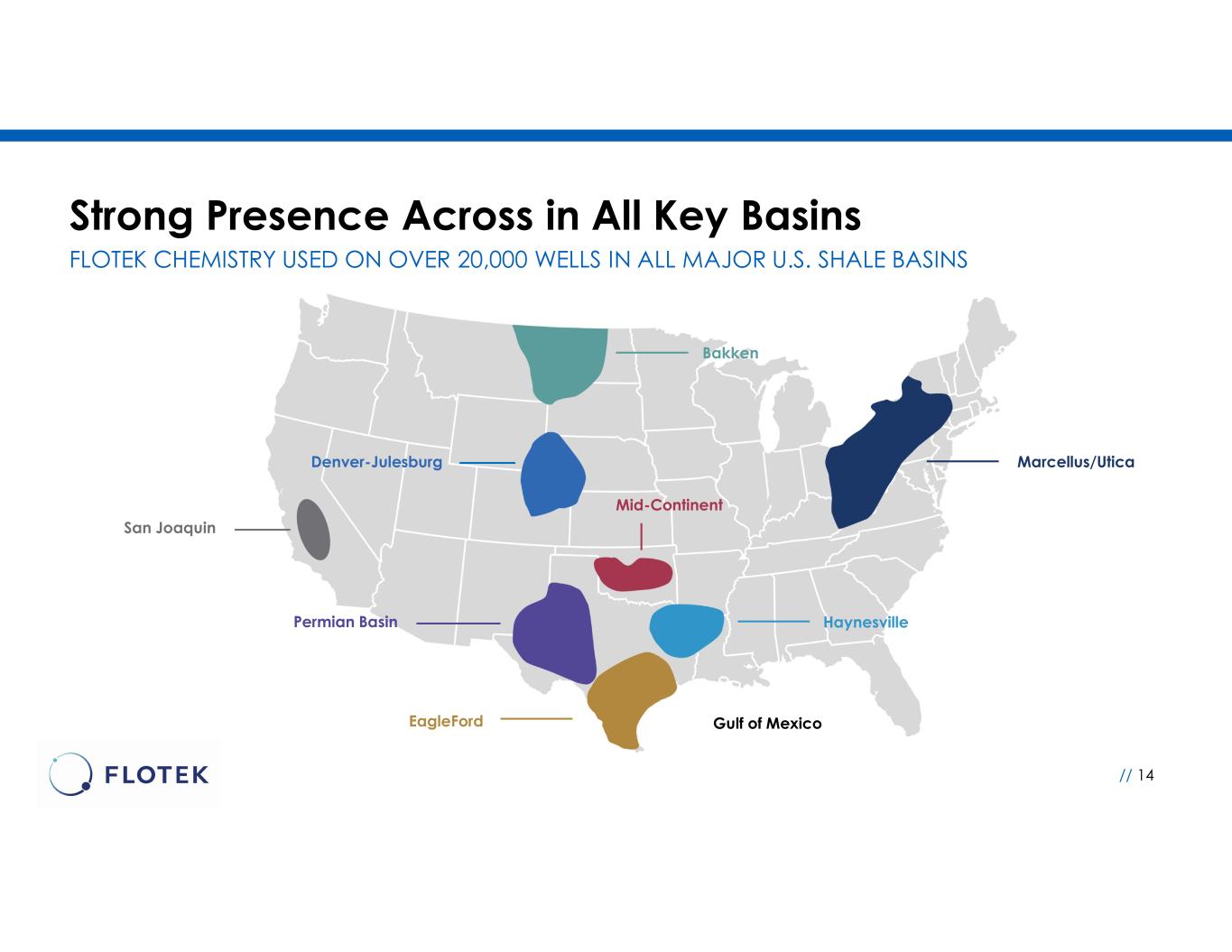Chemical Technologies Business Overview // 13 • Technologically advanced products and services that significantly improve well performance and maximize value of customer’s business • Extensive portfolio of customized solutions that support operations across the value chain • Industry leader in delivering innovative products that increase performance while reducing costs • Strong presence across all major U.S. shale basins • Creative solutions to reduce the environmental impact of energy on air, water, land and people