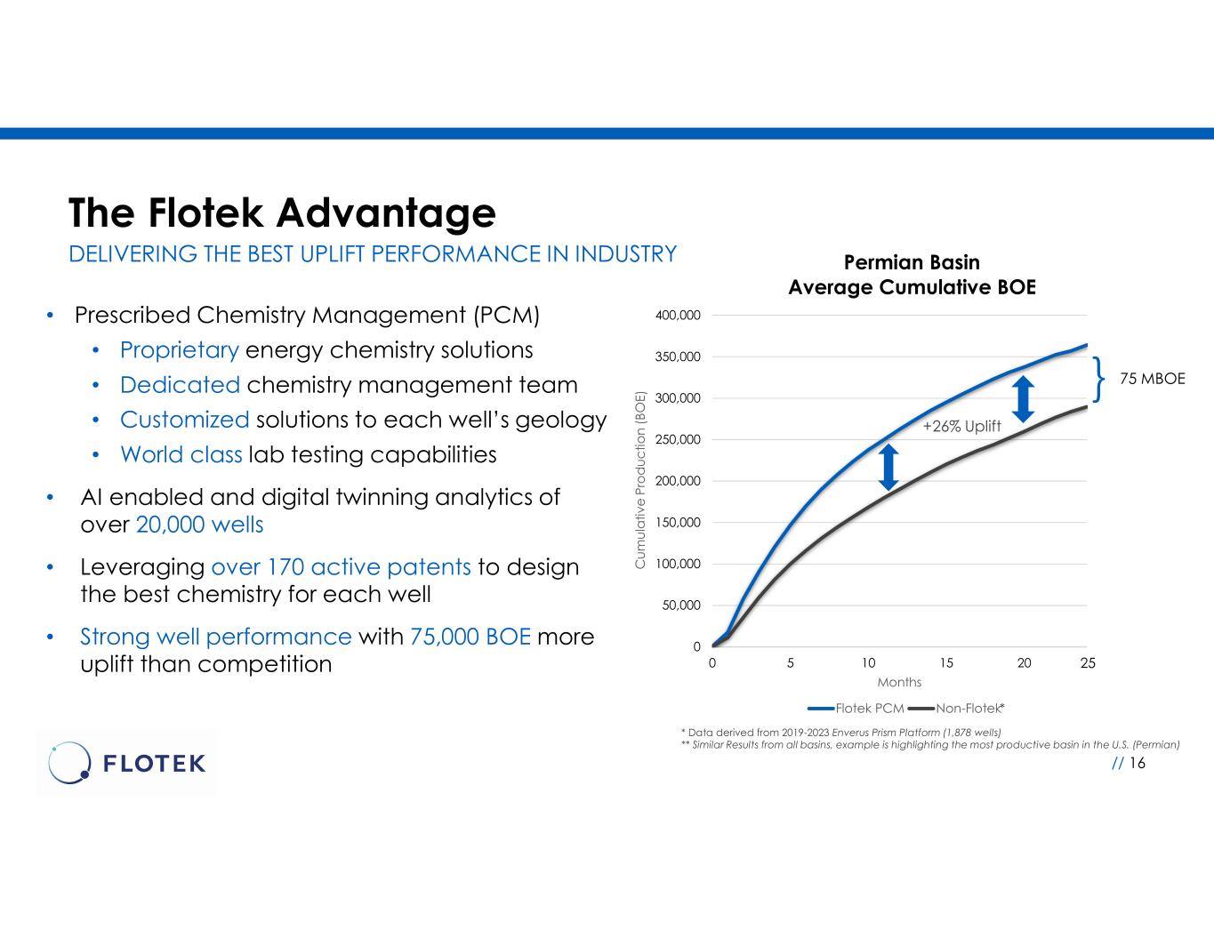 0 50,000 100,000 150,000 200,000 250,000 300,000 350,000 400,000 0 5 10 15 20 C u m u la tiv e P ro d u c tio n (B O E) Months Permian Basin Average Cumulative BOE Flotek PCM Non-Flotek 25 +26% Uplift The Flotek Advantage // 16 • Prescribed Chemistry Management (PCM) • Proprietary energy chemistry solutions • Dedicated chemistry management team • Customized solutions to each well’s geology • World class lab testing capabilities • AI enabled and digital twinning analytics of over 20,000 wells • Leveraging over 170 active patents to design the best chemistry for each well • Strong well performance with 75,000 BOE more uplift than competition * Data derived from 2019-2023 Enverus Prism Platform (1,878 wells) ** Similar Results from all basins, example is highlighting the most productive basin in the U.S. (Permian) 75 MBOE} * DELIVERING THE BEST UPLIFT PERFORMANCE IN INDUSTRY