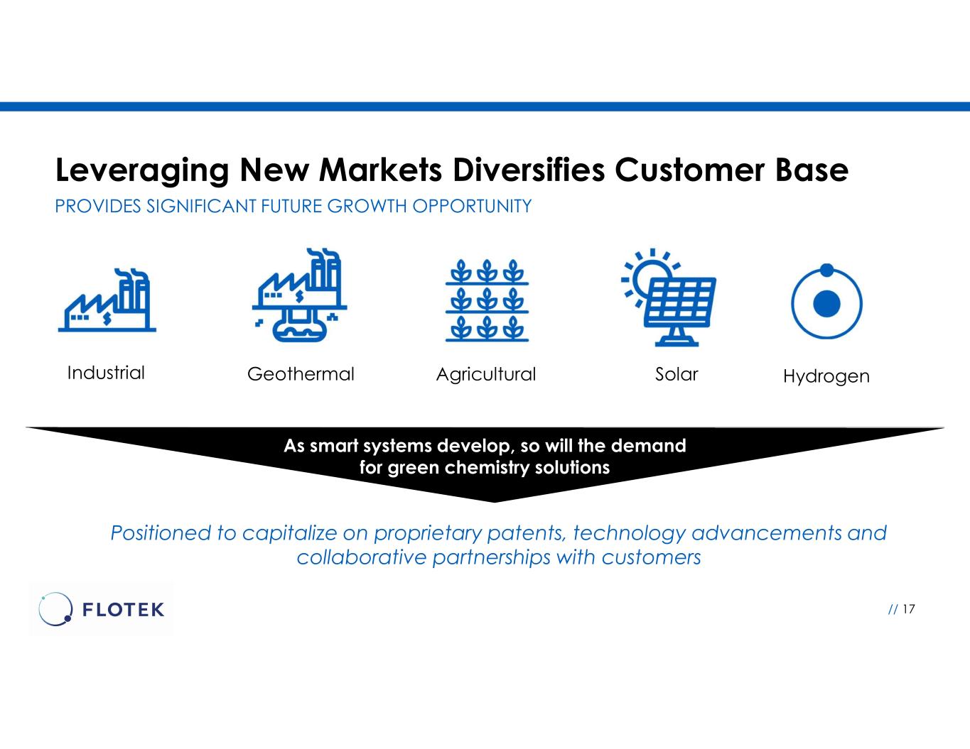 Leveraging New Markets Diversifies Customer Base // 17 PROVIDES SIGNIFICANT FUTURE GROWTH OPPORTUNITY Industrial Geothermal Agricultural Solar Hydrogen As smart systems develop, so will the demand for green chemistry solutions Positioned to capitalize on proprietary patents, technology advancements and collaborative partnerships with customers