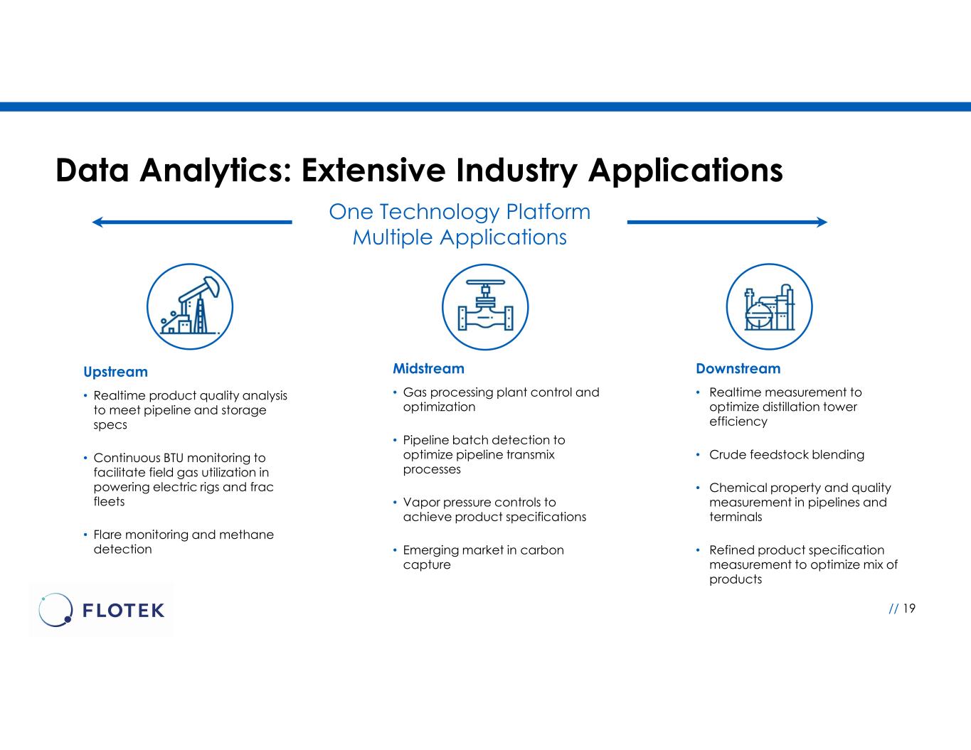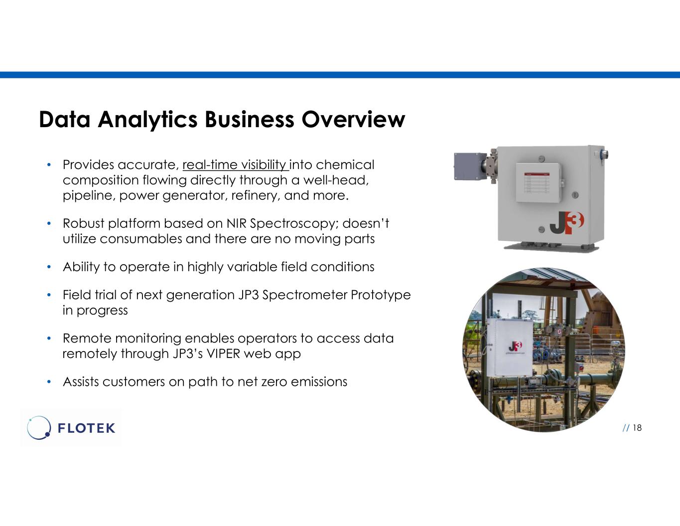 Data Analytics Business Overview // 18 • Provides accurate, real-time visibility into chemical composition flowing directly through a well-head, pipeline, power generator, refinery, and more. • Robust platform based on NIR Spectroscopy; doesn’t utilize consumables and there are no moving parts • Ability to operate in highly variable field conditions • Field trial of next generation JP3 Spectrometer Prototype in progress • Remote monitoring enables operators to access data remotely through JP3’s VIPER web app • Assists customers on path to net zero emissions