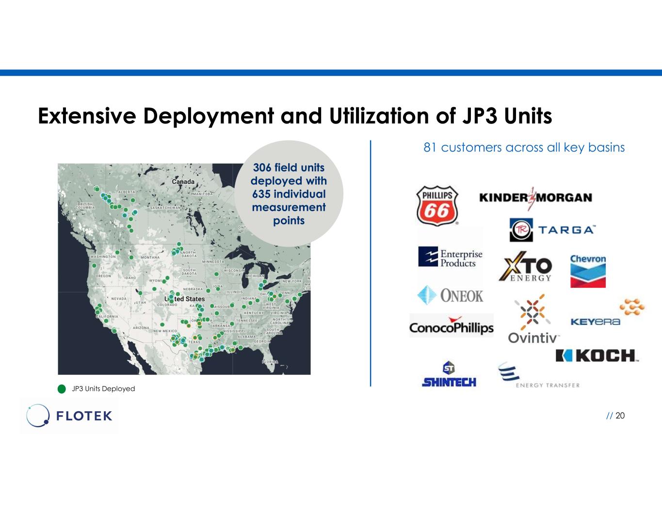 // 20 JP3 Units Deployed Extensive Deployment and Utilization of JP3 Units 81 customers across all key basins 306 field units deployed with 635 individual measurement points