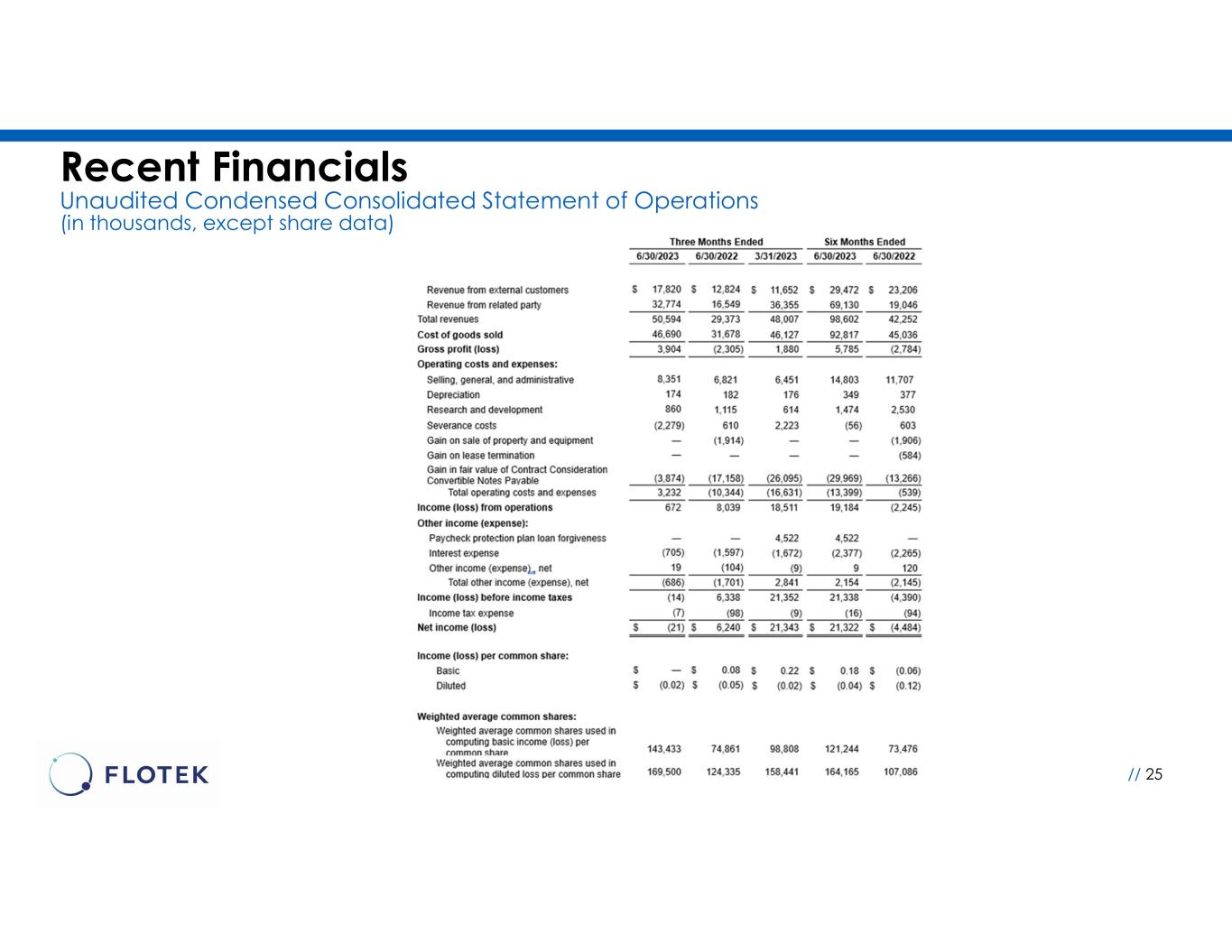 •Severance Costs: Flotek recorded a $2.3 million credit to severance expenses during the second quarter of 2023 in connection with the settlement of a portion of ongoing legacy litigation. The Company had accrued certain severance payments in connection with this litigation in prior years and reversed the accrual during the second quarter after reaching the settlement.