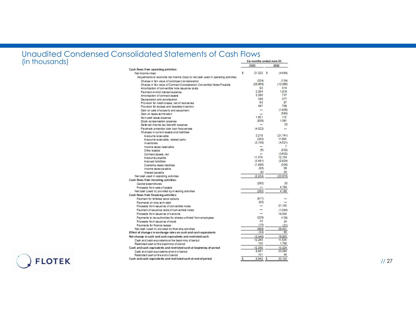 •Net Income (Loss) and EPS: Flotek reported a net loss of $21 thousand, or $0 per basic share, for the second quarter of 2023. This compares to net income of $6.2 million, or $0.08 per basic share, for the second quarter of 2022 and net income of $21.3 million, or $0.22 per basic share, in the first quarter of 2023. Net income/(loss) during the second quarter of 2023 and 2022 and the first quarter of 2023 included non-cash gains on the fair value measurement of convertible notes totaling $3.9 million, $17.2 million, and $26.1 million, respectively.
