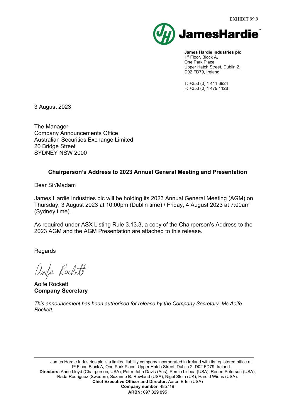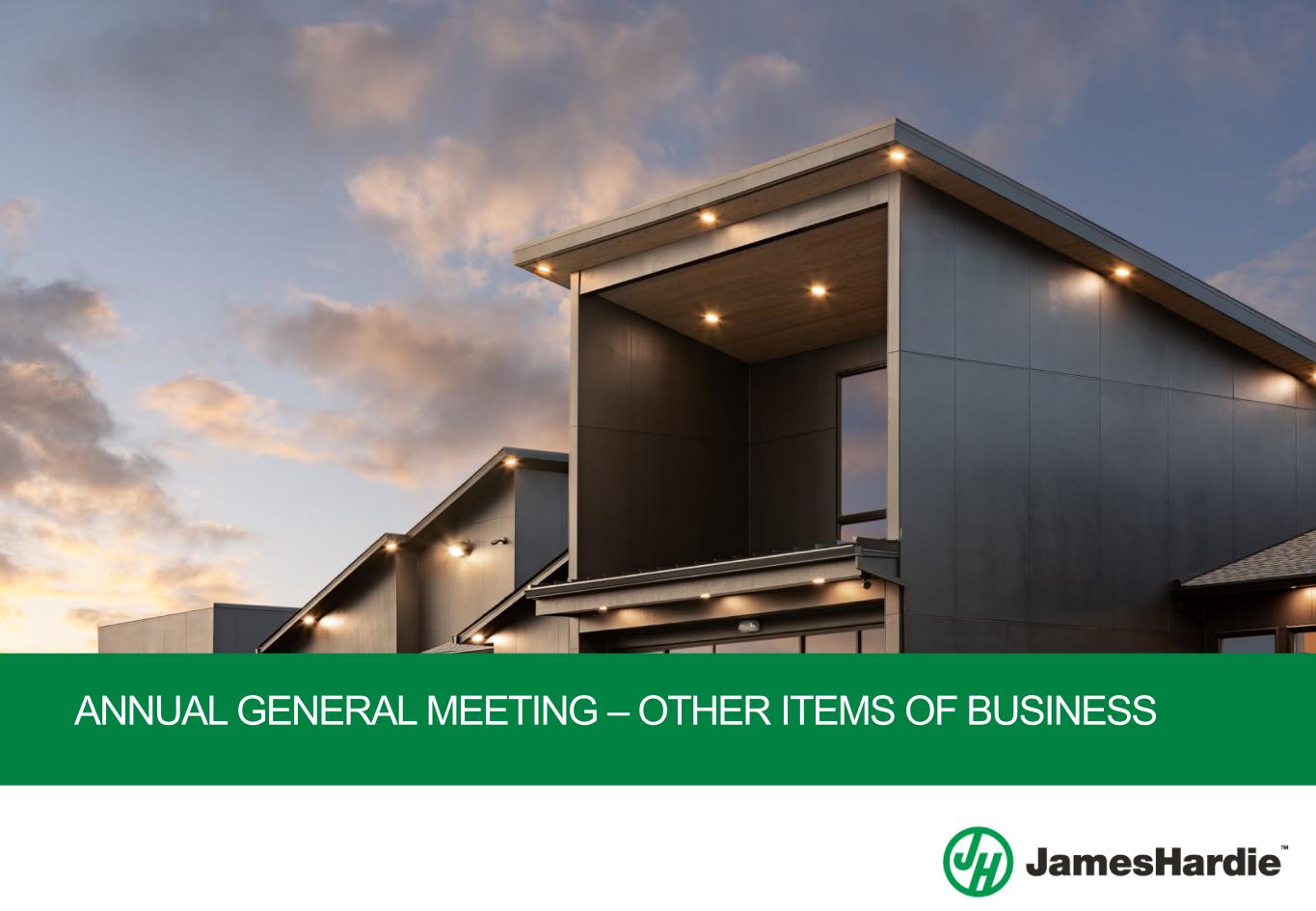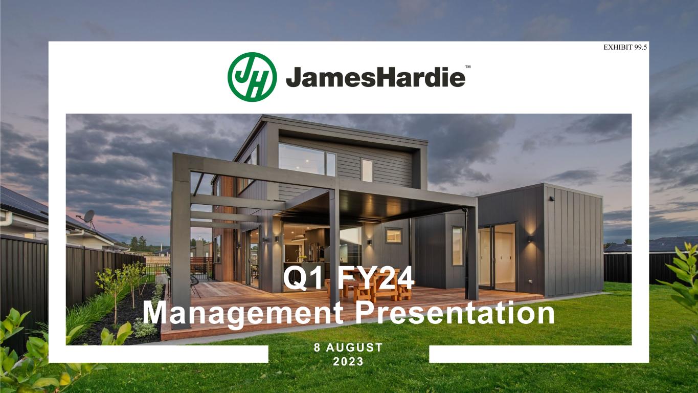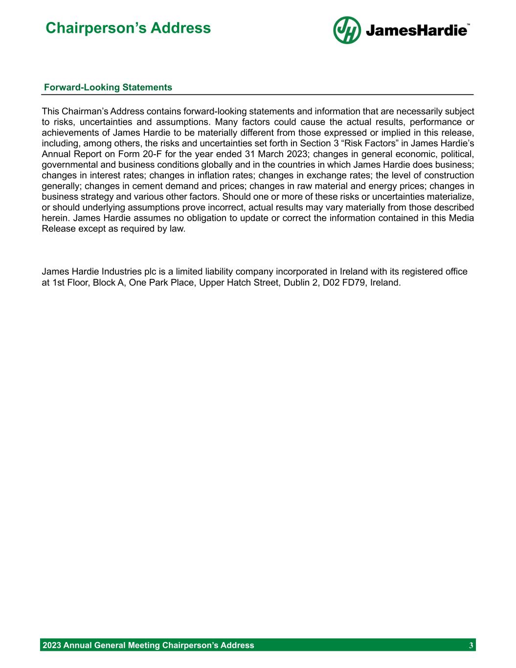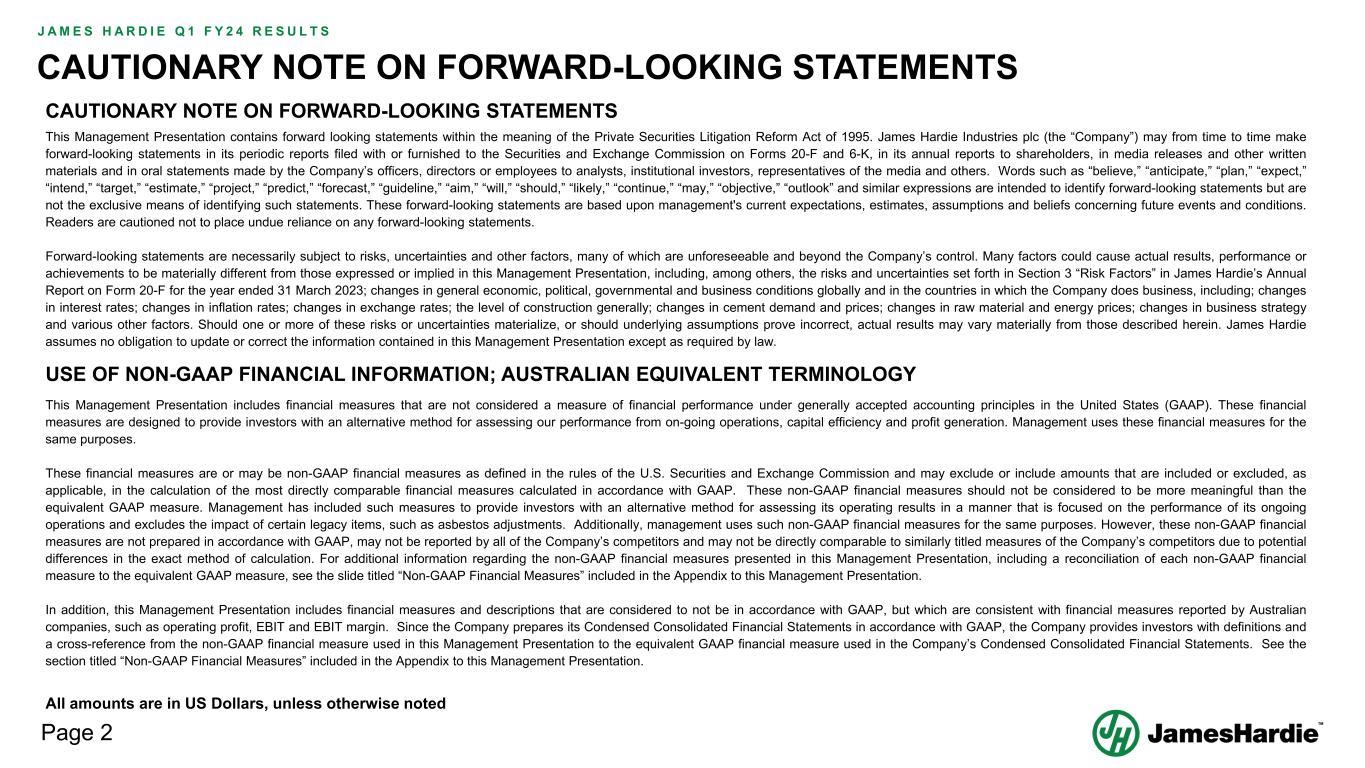 Forward-looking statements are based on the Company’s current expectations, estimates and assumptions and because forward-looking statements address future results, events and conditions, they, by their very nature, involve inherent risks and uncertainties, many of which are unforeseeable and beyond the Company’s control. Such known and unknown risks, uncertainties and other factors may cause actual results, performance or other achievements to differ materially from the anticipated results, performance or achievements expressed, projected or implied by these forward-looking statements. These factors, some of which are discussed under “Risk Factors” in Section 3 of the Form 20-F filed with the Securities and Exchange Commission on 16 May 2023, include, but are not limited to: all matters relating to or arising out of the prior manufacture of products that contained asbestos by current and former Company subsidiaries; required contributions to AICF, any shortfall in AICF funding and the effect of currency exchange rate movements on the amount recorded in the Company’s financial statements as an asbestos liability; compliance with and changes in tax laws and treatments; competition and product pricing in the markets in which the Company operates; the consequences of product failures or defects; exposure to environmental, asbestos, putative consumer class action or other legal proceedings; general economic and market conditions; the supply and cost of raw materials; possible increases in competition and the potential that competitors could copy the Company’s products; compliance with and changes in environmental and health and safety laws; risks of conducting business internationally; compliance with and changes in laws and regulations; currency exchange risks; dependence on customer preference and the concentration of the Company’s customer base; dependence on residential and commercial construction markets; the effect of adverse changes in climate or weather patterns; use of accounting estimates and financial condition and all other risks identified in the Company’s reports filed with Australian, Irish and US securities regulatory agencies and exchanges (as appropriate). The Company cautions you that the foregoing list of factors is not exhaustive and that other risks and uncertainties may cause actual results to differ materially from those referenced in the Company’s forward-looking statements. Forward-looking statements speak only as of the date they are made and are statements of the Company’s current expectations concerning future results, events and conditions. The Company assumes no obligation to update any forward-looking statements or information except as required by law.