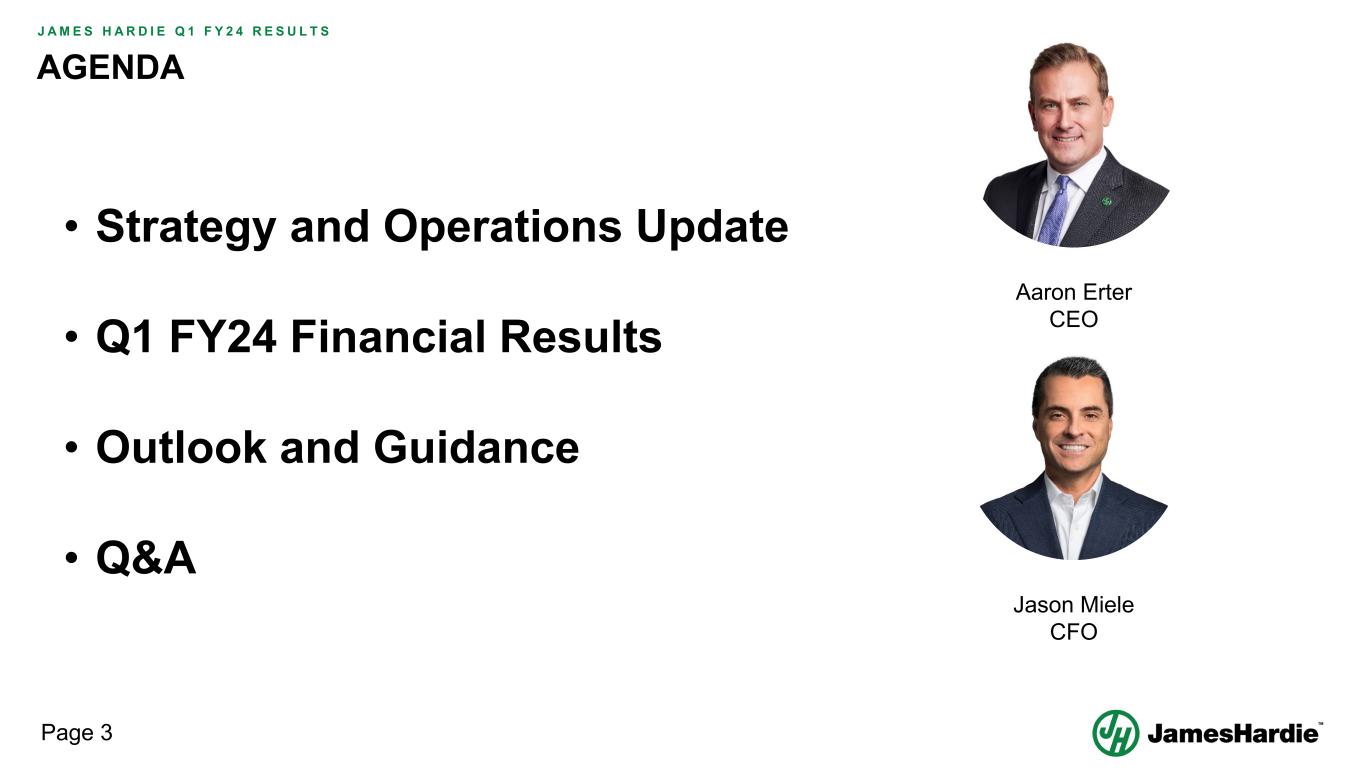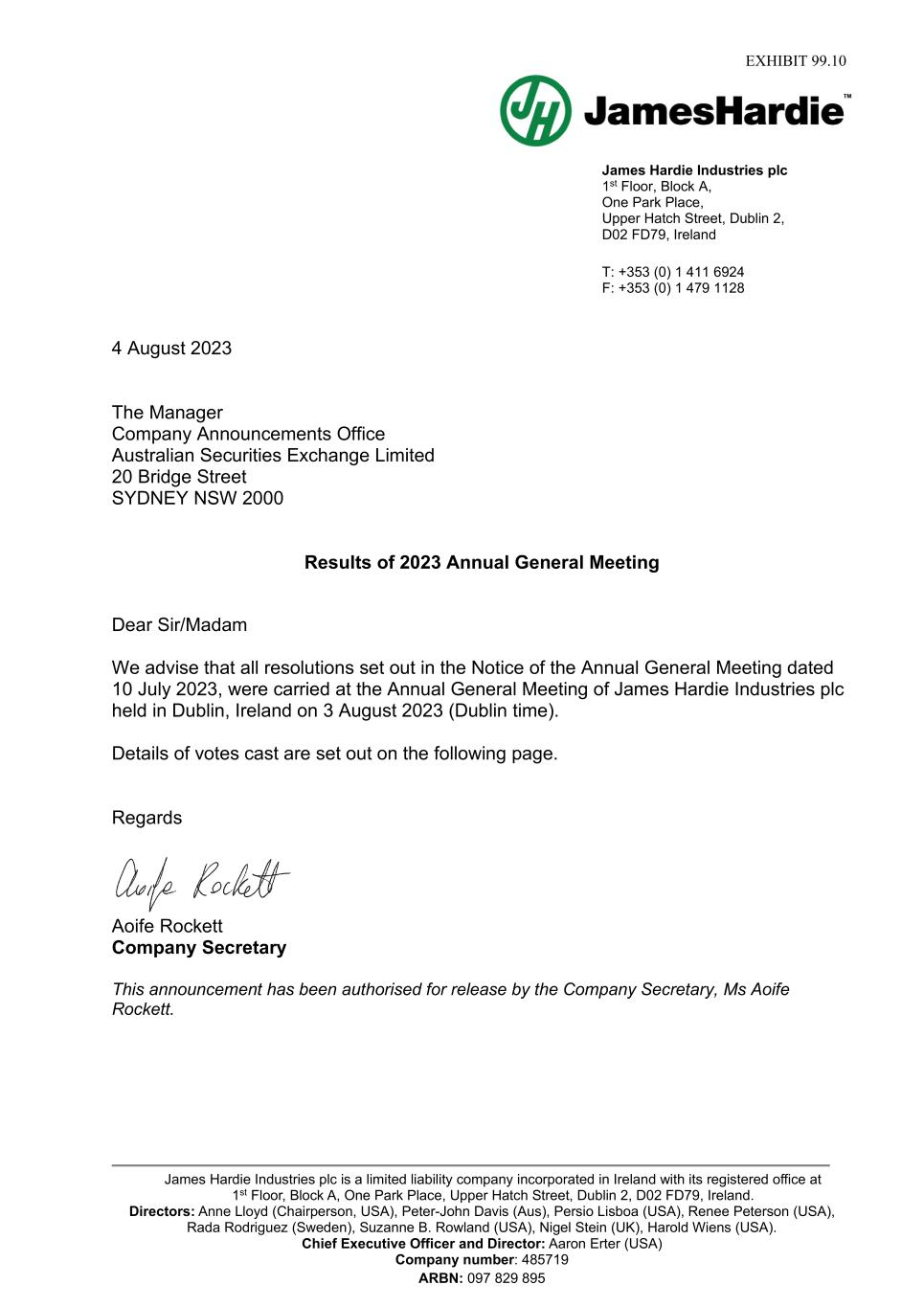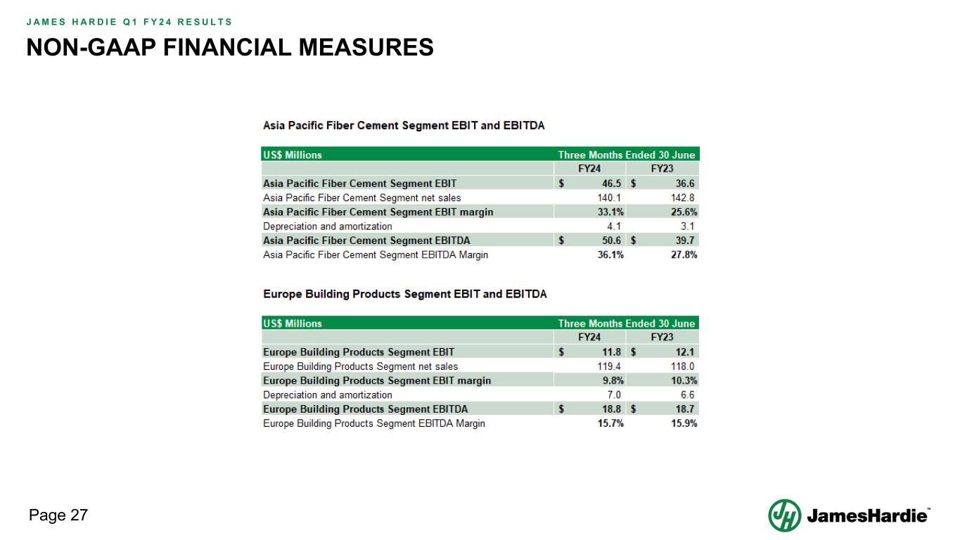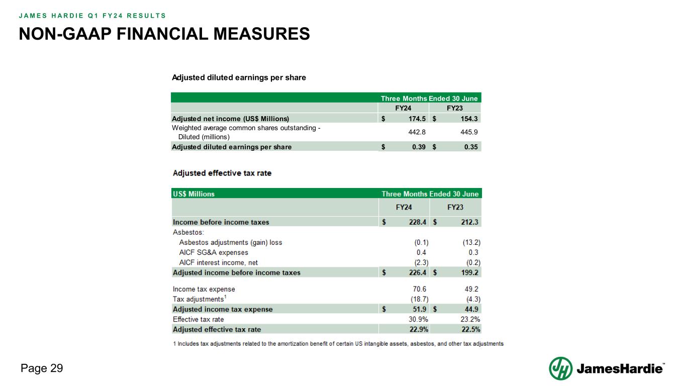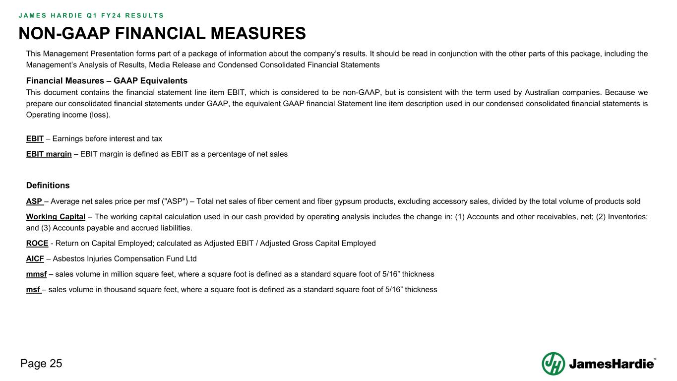 Forward-looking statements are based on the Company’s current expectations, estimates and assumptions and because forward-looking statements address future results, events and conditions, they, by their very nature, involve inherent risks and uncertainties, many of which are unforeseeable and beyond the Company’s control. Such known and unknown risks, uncertainties and other factors may cause actual results, performance or other achievements to differ materially from the anticipated results, performance or achievements expressed, projected or implied by these forward-looking statements. These factors, some of which are discussed under “Risk Factors” in Section 3 of the Form 20-F filed with the Securities and Exchange Commission on 16 May 2023, include, but are not limited to: all matters relating to or arising out of the prior manufacture of products that contained asbestos by current and former Company subsidiaries; required contributions to AICF, any shortfall in AICF funding and the effect of currency exchange rate movements on the amount recorded in the Company’s financial statements as an asbestos liability; compliance with and changes in tax laws and treatments; competition and product pricing in the markets in which the Company operates; the consequences of product failures or defects; exposure to environmental, asbestos, putative consumer class action or other legal proceedings; general economic and market conditions; the supply and cost of raw materials; possible increases in competition and the potential that competitors could copy the Company’s products; compliance with and changes in environmental and health and safety laws; risks of conducting business internationally; compliance with and changes in laws and regulations; currency exchange risks; dependence on customer preference and the concentration of the Company’s customer base; dependence on residential and commercial construction markets; the effect of adverse changes in climate or weather patterns; use of accounting estimates and financial condition and all other risks identified in the Company’s reports filed with Australian, Irish and US securities regulatory agencies and exchanges (as appropriate). The Company cautions you that the foregoing list of factors is not exhaustive and that other risks and uncertainties may cause actual results to differ materially from those referenced in the Company’s forward-looking statements. Forward-looking statements speak only as of the date they are made and are statements of the Company’s current expectations concerning future results, events and conditions. The Company assumes no obligation to update any forward-looking statements or information except as required by law.