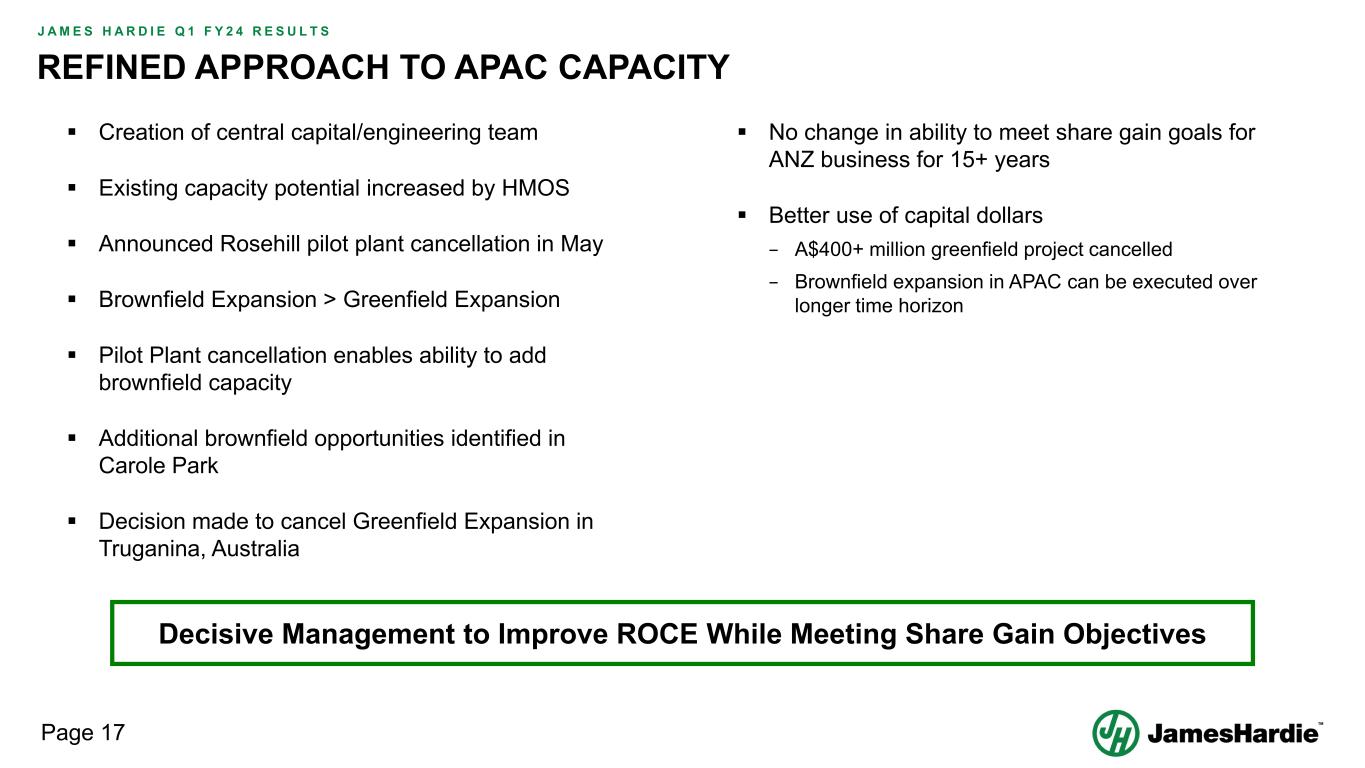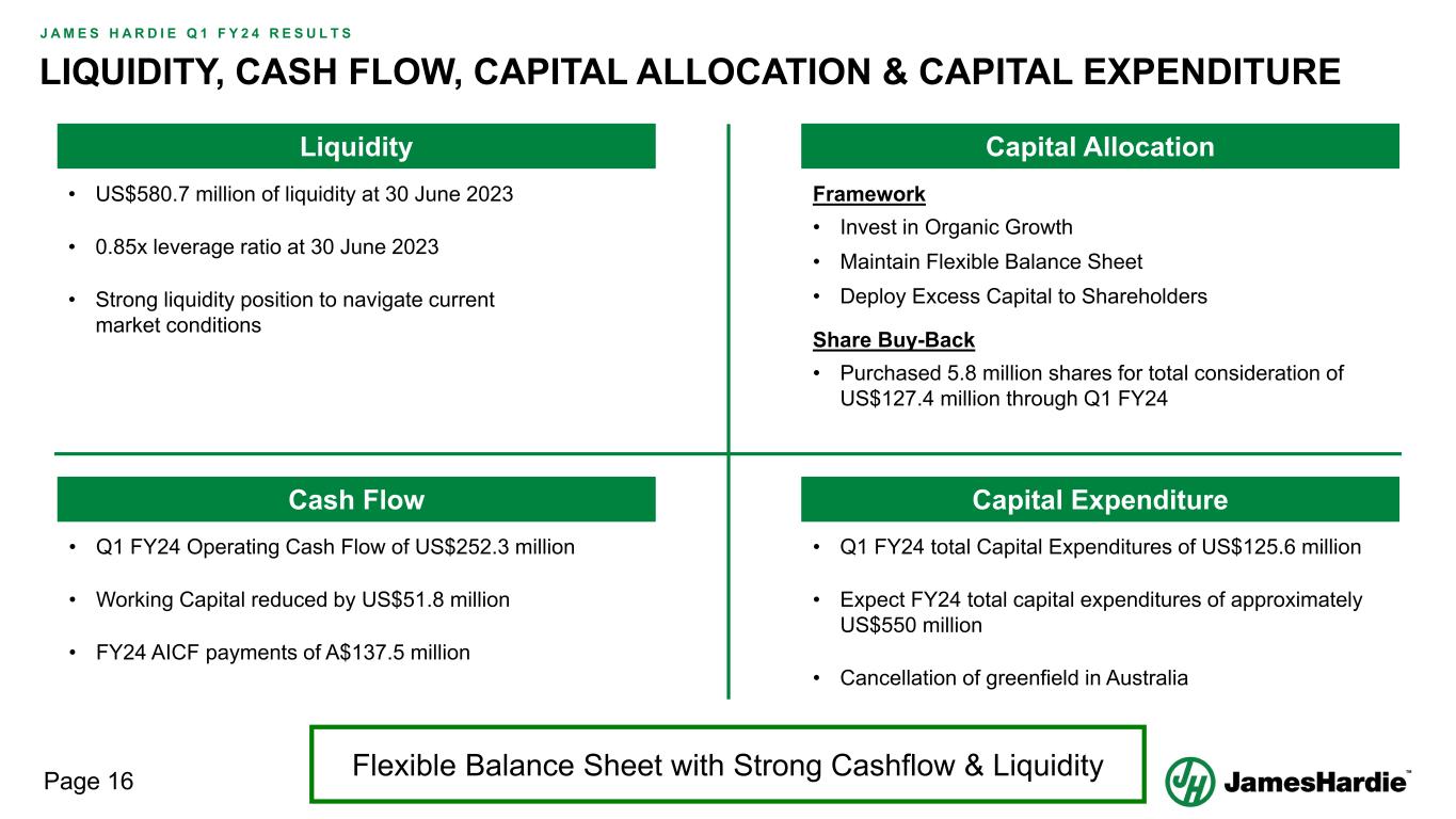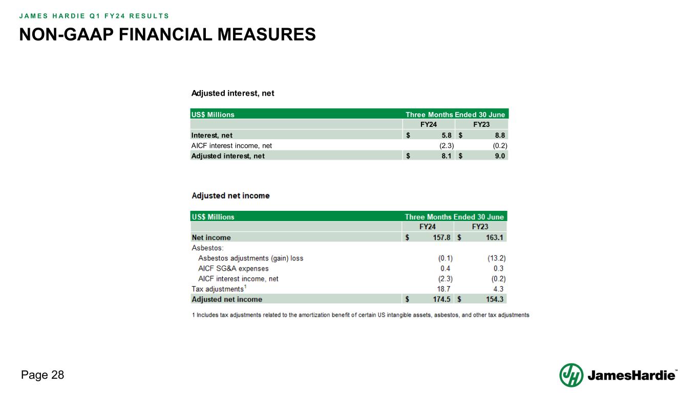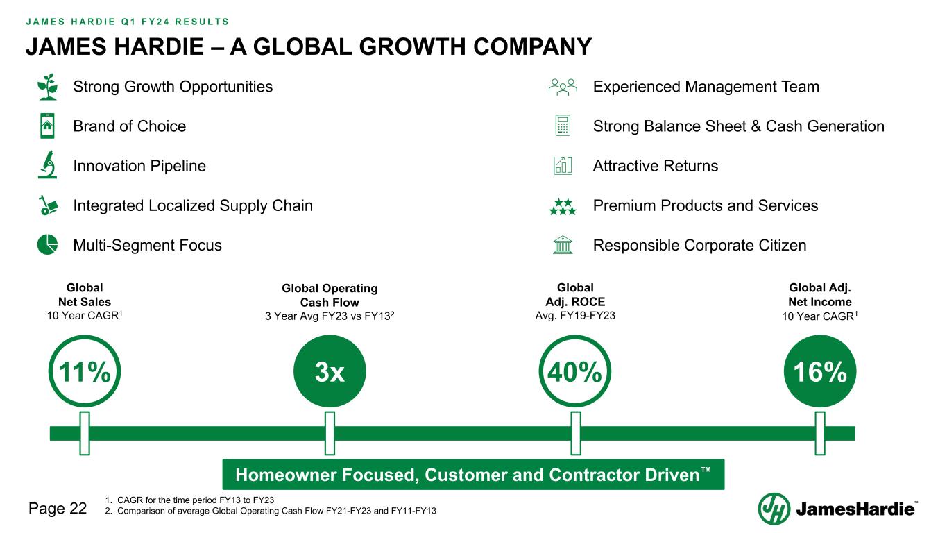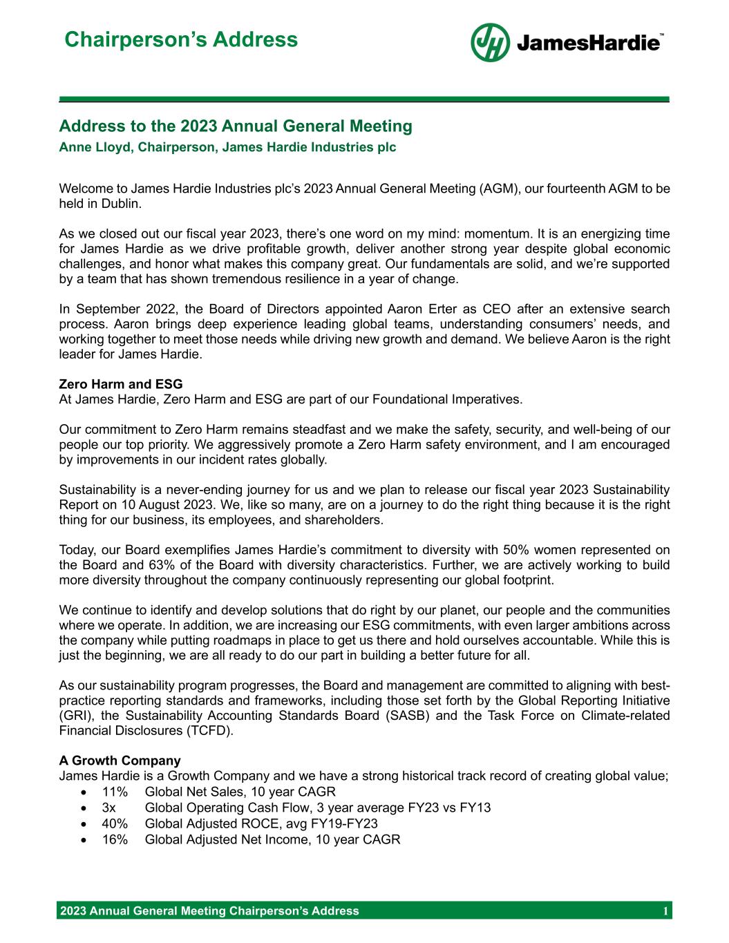 Forward-looking statements are based on the Company’s current expectations, estimates and assumptions and because forward-looking statements address future results, events and conditions, they, by their very nature, involve inherent risks and uncertainties, many of which are unforeseeable and beyond the Company’s control. Such known and unknown risks, uncertainties and other factors may cause actual results, performance or other achievements to differ materially from the anticipated results, performance or achievements expressed, projected or implied by these forward-looking statements. These factors, some of which are discussed under “Risk Factors” in Section 3 of the Form 20-F filed with the Securities and Exchange Commission on 16 May 2023, include, but are not limited to: all matters relating to or arising out of the prior manufacture of products that contained asbestos by current and former Company subsidiaries; required contributions to AICF, any shortfall in AICF funding and the effect of currency exchange rate movements on the amount recorded in the Company’s financial statements as an asbestos liability; compliance with and changes in tax laws and treatments; competition and product pricing in the markets in which the Company operates; the consequences of product failures or defects; exposure to environmental, asbestos, putative consumer class action or other legal proceedings; general economic and market conditions; the supply and cost of raw materials; possible increases in competition and the potential that competitors could copy the Company’s products; compliance with and changes in environmental and health and safety laws; risks of conducting business internationally; compliance with and changes in laws and regulations; currency exchange risks; dependence on customer preference and the concentration of the Company’s customer base; dependence on residential and commercial construction markets; the effect of adverse changes in climate or weather patterns; use of accounting estimates and financial condition and all other risks identified in the Company’s reports filed with Australian, Irish and US securities regulatory agencies and exchanges (as appropriate). The Company cautions you that the foregoing list of factors is not exhaustive and that other risks and uncertainties may cause actual results to differ materially from those referenced in the Company’s forward-looking statements. Forward-looking statements speak only as of the date they are made and are statements of the Company’s current expectations concerning future results, events and conditions. The Company assumes no obligation to update any forward-looking statements or information except as required by law.