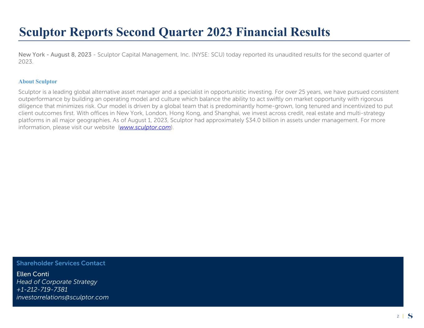 |2 New York - August 8, 2023 - Sculptor Capital Management, Inc. (NYSE: SCU) today reported its unaudited results for the second quarter of 2023. About Sculptor Sculptor is a leading global alternative asset manager and a specialist in opportunistic investing. For over 25 years, we have pursued consistent outperformance by building an operating model and culture which balance the ability to act swiftly on market opportunity with rigorous diligence that minimizes risk. Our model is driven by a global team that is predominantly home-grown, long tenured and incentivized to put client outcomes first. With offices in New York, London, Hong Kong, and Shanghai, we invest across credit, real estate and multi-strategy platforms in all major geographies. As of August 1, 2023, Sculptor had approximately $34.0 billion in assets under management. For more information, please visit our website (www.sculptor.com). 2 Sculptor Reports Second Quarter 2023 Financial Results Shareholder Services Contact Ellen Conti Head of Corporate Strategy +1-212-719-7381 investorrelations@sculptor.com JIMMY LEVIN CHIEF INVESTMENT OFFICER & CHIEF EXECUTIVE OFFICER