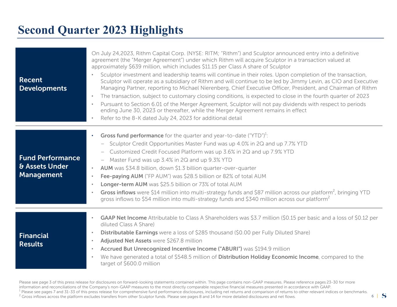 |5 (dollars in millions, except per share amounts) 2Q '23 1Q '23 2Q '22 YTD '23 YTD '22 GAAP Results Net (Loss) Income Attributable to Sculptor Capital Management $ (4.4) $ 9.7 $ (8.8) $ 5.3 $ 5.0 Net Income (Loss) Attributable to Class A Shareholders 3.7 8.5 (8.1) 12.1 8.8 Earnings (Loss) per Class A Share - basic 0.15 0.34 (0.32) 0.48 0.34 (Loss) Earnings per Class A Share - diluted (0.12) 0.05 (0.89) (0.05) (1.00) Non-GAAP Financial Measures Distributable Earnings $ (0.3) $ 14.2 $ 32.1 $ 13.9 $ 61.2 Distributable Earnings Per Fully Diluted Share 0.00 0.25 0.55 0.24 1.03 Adjusted Net Assets 267.8 268.6 304.2 267.8 304.2 Accrued but Unrecognized Incentive Income (“ABURI”) 194.9 162.6 188.5 194.9 188.5 Capital Metrics Assets Under Management $ 34,759 $ 36,087 $ 36,860 $ 34,759 $ 36,860 ▪ GAAP Net Income Attributable to Class A Shareholders of $3.7 million for 2Q, or $0.15 per basic and a loss of $0.12 per diluted Class A Share ▪ Distributable Earnings were a loss of $285 thousand for 2Q, or $0.00 per Fully Diluted Share Please see page 3 of this press release for disclosures on forward-looking statements contained within. This page contains non-GAAP measures, including Distributable Earnings, Adjusted Net Assets, and Accrued but Unrecognized Incentive Income. Please reference pages 23-30 for more information and reconciliations of the Company's non-GAAP measures to the most directly comparable respective financial measures presented in accordance with GAAP. Second Quarter 2023 Financial Highlights