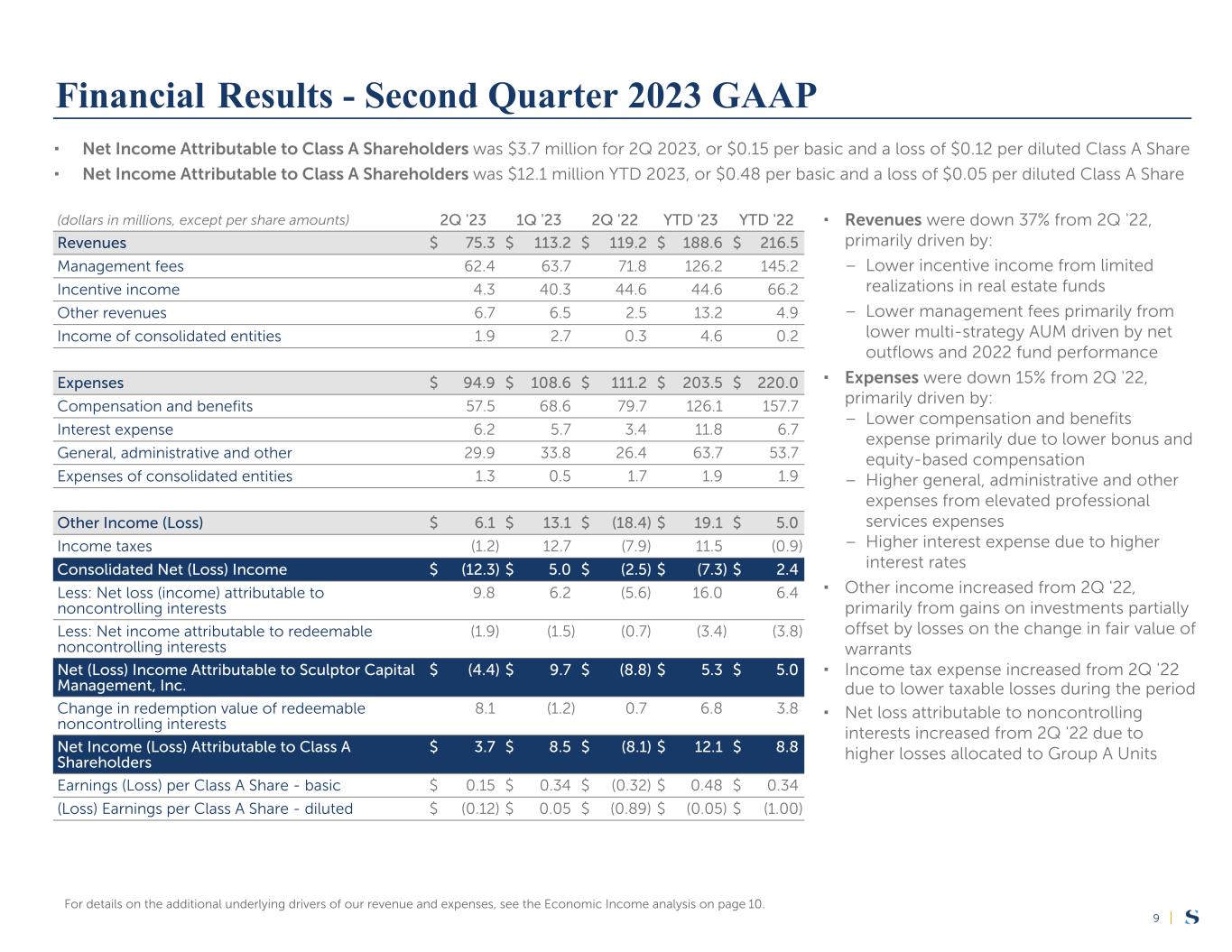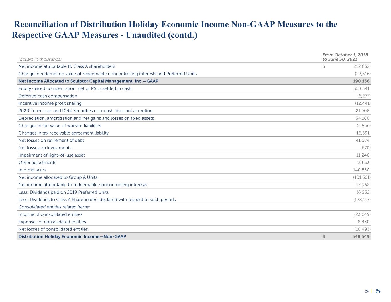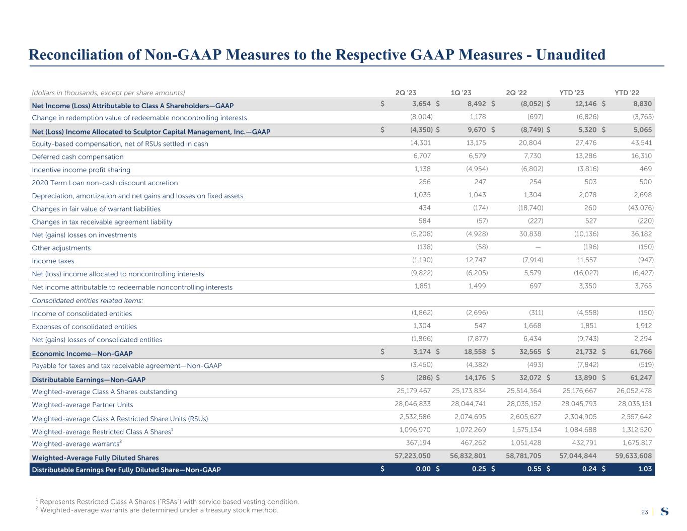 |23 (dollars in thousands, except per share amounts) 2Q '23 1Q '23 2Q '22 YTD '23 YTD '22 Net Income (Loss) Attributable to Class A Shareholders—GAAP $ 3,654 $ 8,492 $ (8,052) $ 12,146 $ 8,830 Change in redemption value of redeemable noncontrolling interests (8,004) 1,178 (697) (6,826) (3,765) Net (Loss) Income Allocated to Sculptor Capital Management, Inc.—GAAP $ (4,350) $ 9,670 $ (8,749) $ 5,320 $ 5,065 Equity-based compensation, net of RSUs settled in cash 14,301 13,175 20,804 27,476 43,541 Deferred cash compensation 6,707 6,579 7,730 13,286 16,310 Incentive income profit sharing 1,138 (4,954) (6,802) (3,816) 469 2020 Term Loan non-cash discount accretion 256 247 254 503 500 Depreciation, amortization and net gains and losses on fixed assets 1,035 1,043 1,304 2,078 2,698 Changes in fair value of warrant liabilities 434 (174) (18,740) 260 (43,076) Changes in tax receivable agreement liability 584 (57) (227) 527 (220) Net (gains) losses on investments (5,208) (4,928) 30,838 (10,136) 36,182 Other adjustments (138) (58) — (196) (150) Income taxes (1,190) 12,747 (7,914) 11,557 (947) Net (loss) income allocated to noncontrolling interests (9,822) (6,205) 5,579 (16,027) (6,427) Net income attributable to redeemable noncontrolling interests 1,851 1,499 697 3,350 3,765 Consolidated entities related items: Income of consolidated entities (1,862) (2,696) (311) (4,558) (150) Expenses of consolidated entities 1,304 547 1,668 1,851 1,912 Net (gains) losses of consolidated entities (1,866) (7,877) 6,434 (9,743) 2,294 Economic Income—Non-GAAP $ 3,174 $ 18,558 $ 32,565 $ 21,732 $ 61,766 Payable for taxes and tax receivable agreement—Non-GAAP (3,460) (4,382) (493) (7,842) (519) Distributable Earnings—Non-GAAP $ (286) $ 14,176 $ 32,072 $ 13,890 $ 61,247 Weighted-average Class A Shares outstanding 25,179,467 25,173,834 25,514,364 25,176,667 26,052,478 Weighted-average Partner Units 28,046,833 28,044,741 28,035,152 28,045,793 28,035,151 Weighted-average Class A Restricted Share Units (RSUs) 2,532,586 2,074,695 2,605,627 2,304,905 2,557,642 Weighted-average Restricted Class A Shares1 1,096,970 1,072,269 1,575,134 1,084,688 1,312,520 Weighted-average warrants2 367,194 467,262 1,051,428 432,791 1,675,817 Weighted-Average Fully Diluted Shares 57,223,050 56,832,801 58,781,705 57,044,844 59,633,608 Distributable Earnings Per Fully Diluted Share—Non-GAAP $ 0.00 $ 0.25 $ 0.55 $ 0.24 $ 1.03 1 Represents Restricted Class A Shares ("RSAs") with service based vesting condition. 2 Weighted-average warrants are determined under a treasury stock method. Reconciliation of Non-GAAP Measures to the Respective GAAP Measures - Unaudited