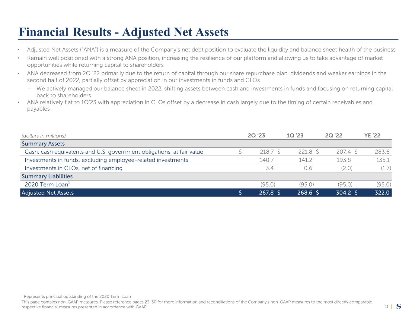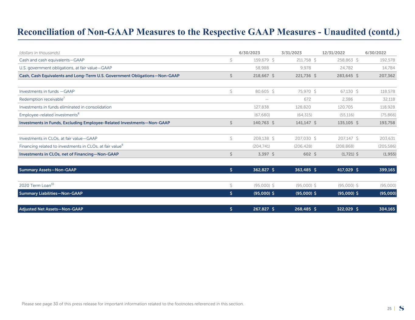 |25 (dollars in thousands) 6/30/2023 3/31/2023 12/31/2022 6/30/2022 Cash and cash equivalents—GAAP $ 159,679 $ 211,758 $ 258,863 $ 192,578 U.S. government obligations, at fair value—GAAP 58,988 9,978 24,782 14,784 Cash, Cash Equivalents and Long-Term U.S. Government Obligations—Non-GAAP $ 218,667 $ 221,736 $ 283,645 $ 207,362 Investments in funds —GAAP $ 80,605 $ 75,970 $ 67,130 $ 118,578 Redemption receivable7 — 672 2,386 32,118 Investments in funds eliminated in consolidation 127,838 128,820 120,705 118,928 Employee-related investments8 (67,680) (64,315) (55,116) (75,866) Investments in Funds, Excluding Employee-Related Investments—Non-GAAP $ 140,763 $ 141,147 $ 135,105 $ 193,758 Investments in CLOs, at fair value—GAAP $ 208,138 $ 207,030 $ 207,147 $ 203,631 Financing related to investments in CLOs, at fair value9 (204,741) (206,428) (208,868) (205,586) Investments in CLOs, net of Financing—Non-GAAP $ 3,397 $ 602 $ (1,721) $ (1,955) Summary Assets—Non-GAAP $ 362,827 $ 363,485 $ 417,029 $ 399,165 2020 Term Loan10 $ (95,000) $ (95,000) $ (95,000) $ (95,000) Summary Liabilities—Non-GAAP $ (95,000) $ (95,000) $ (95,000) $ (95,000) Adjusted Net Assets—Non-GAAP $ 267,827 $ 268,485 $ 322,029 $ 304,165 Reconciliation of Non-GAAP Measures to the Respective GAAP Measures - Unaudited (contd.) Please see page 30 of this press release for important information related to the footnotes referenced in this section.