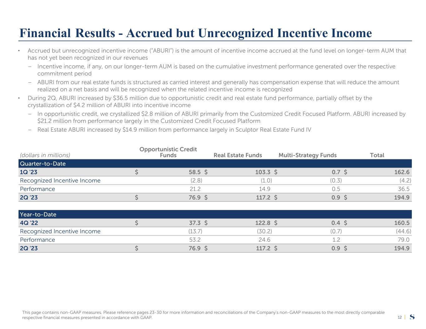 |12 (dollars in millions) Opportunistic Credit Funds Real Estate Funds Multi-Strategy Funds Total Quarter-to-Date 1Q '23 $ 58.5 $ 103.3 $ 0.7 $ 162.6 Recognized Incentive Income (2.8) (1.0) (0.3) (4.2) Performance 21.2 14.9 0.5 36.5 2Q '23 $ 76.9 $ 117.2 $ 0.9 $ 194.9 Year-to-Date 4Q '22 $ 37.3 $ 122.8 $ 0.4 $ 160.5 Recognized Incentive Income (13.7) (30.2) (0.7) (44.6) Performance 53.2 24.6 1.2 79.0 2Q '23 $ 76.9 $ 117.2 $ 0.9 $ 194.9 This page contains non-GAAP measures. Please reference pages 23-30 for more information and reconciliations of the Company's non-GAAP measures to the most directly comparable respective financial measures presented in accordance with GAAP. ▪ Accrued but unrecognized incentive income (“ABURI”) is the amount of incentive income accrued at the fund level on longer-term AUM that has not yet been recognized in our revenues – Incentive income, if any, on our longer-term AUM is based on the cumulative investment performance generated over the respective commitment period – ABURI from our real estate funds is structured as carried interest and generally has compensation expense that will reduce the amount realized on a net basis and will be recognized when the related incentive income is recognized ▪ During 2Q, ABURI increased by $36.5 million due to opportunistic credit and real estate fund performance, partially offset by the crystallization of $4.2 million of ABURI into incentive income – In opportunistic credit, we crystallized $2.8 million of ABURI primarily from the Customized Credit Focused Platform. ABURI increased by $21.2 million from performance largely in the Customized Credit Focused Platform – Real Estate ABURI increased by $14.9 million from performance largely in Sculptor Real Estate Fund IV Financial Results - Accrued but Unrecognized Incentive Income