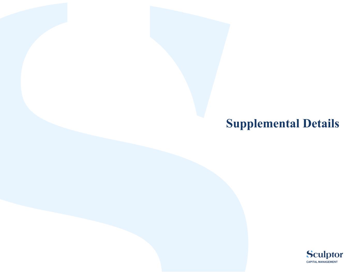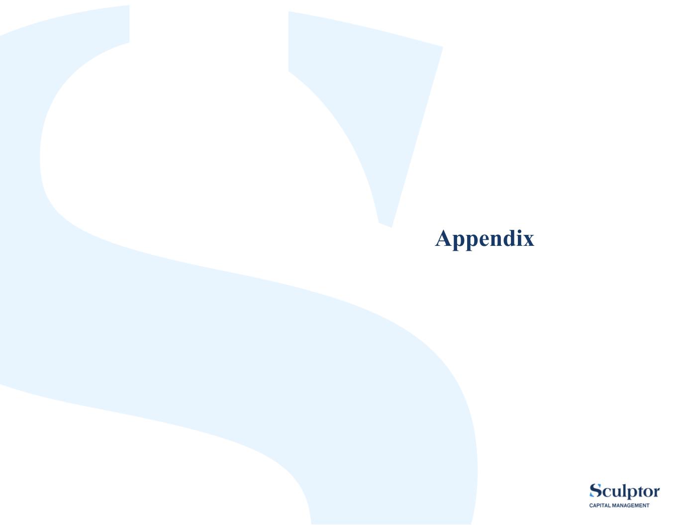 |29 Notes (contd.) Non-GAAP and Other Measures (contd.) Distribution Holiday Economic Income is the cumulative amount of Economic Income earned since October 1, 2018, less any dividends paid to Class A Shareholders or on the now-retired Preferred Units. Distribution Holiday Economic Income is a non-GAAP measure that is defined in the agreements of limited partnership of the Sculptor Operating Partnerships and is being presented to provide an update on the progress made toward the $600.0 million target required to exit the Distribution Holiday. Economic Income is a measure of pre-tax operating performance that excludes the following from our results on a GAAP basis: • Equity-based compensation expenses, net of cash settled RSUs. When the number of RSUs to be settled in cash is discretionary at the time of the grant, then the fair value of RSUs that are settled in cash is included as an expense at the time of settlement. When the number of RSUs to be settled in cash is certain on the grant date, then the expense is recognized during the performance period to which the award relates. • Amounts related to non-cash interest expense accretion on term debt. Management excludes this non-cash expense from Economic Income, as it does not consider it to be reflective of our economic borrowing costs. • Depreciation and amortization expenses, changes in fair value of warrant liabilities, changes in the tax receivable agreement liability, net losses on retirement of debt, gains and losses on fixed assets, and gains and losses on investments in funds, as management does not consider these items to be reflective of operating performance. • Impairment of right-of-use lease assets is excluded from Economic Income at the time the impairment is recognized for GAAP and the impact is then amortized over the lease term for Economic Income, as management evaluates impairment expenses over the life of the related lease asset and considers the impairment charge to be nonrecurring in nature. Additionally, rent expense is offset by subrental income as management evaluates rent expenses on a net basis. • Income allocations to our executive managing directors on their direct interests in the Sculptor Operating Group. Management reviews operating performance at the Sculptor Operating Group level, where our operations are performed, prior to making any income allocations. • Net income (loss) attributable to redeemable noncontrolling interests, which relates to our consolidated SPAC that was liquidated during the second quarter of 2023, is also eliminated as management does not consider this to be reflective of operating performance. • Amounts related to the consolidated entities, as management does not consider these amounts to be representative of our core operating performance. We also exclude the related eliminations of management fees and incentive income, as management reviews the total amount of management fees and incentive income earned in relation to total AUM and fund performance. Additionally, management fees are presented net of recurring placement and related service fees, as management considers these fees a reduction in management fees, not an expense. Expenses related to incentive income profit-sharing arrangements are generally recognized at the same time the related incentive income revenue is recognized, as management reviews the compensation expense related to these arrangements in relation to any incentive income earned from the relevant fund. Further, for Economic Income deferred cash compensation is expensed in full during the performance period to which the award relates, rather than over the service period for GAAP, as management views the compensation expense impact in relation to the performance period. As a result of the adjustments described above, management fees, incentive income, other revenues, compensation and benefits, interest expense, general, administrative and other expenses, net income (loss) attributable to noncontrolling interests and net income (loss) attributable to redeemable noncontrolling interests as presented on an Economic Income basis are also non-GAAP measures. Our non-GAAP financial measures should not be considered alternatives to our GAAP net income allocated to Class A Shareholders or cash flow from operations, or as indicative of liquidity or the cash available to fund operations. Our non-GAAP measures may not be comparable to similarly titled measures used by other companies.