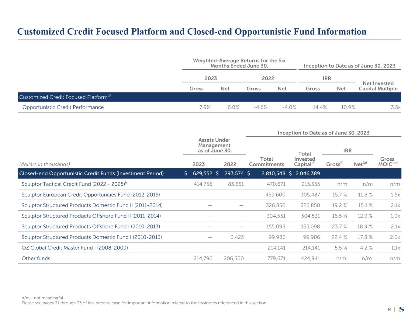 |15 Assets Under Management as of June 30, Returns(a) for the Six Months Ended June 30, Annualized Returns Since Inception Through June 30, 20232023 2022 (dollars in thousands) 2023 2022 Gross Net Gross Net Gross Net Credit $ 22,006,332 $ 22,486,161 Opportunistic credit funds: 5,831,145 6,026,297 Sculptor Credit Opportunities Master Fund(b) 1,604,095 1,904,832 7.7 % 6.5 % (2.4) % (2.8) % 12.7 % 9.0 % Customized Credit Focused Platform 3,597,498 3,827,891 See page 16 for information on our Customized Credit Focused Platform. Closed-end opportunistic credit funds 629,552 293,574 See page 16 for information on our closed-end opportunistic credit funds. Institutional Credit Strategies 16,175,187 16,459,864 See page 17 for information on our Institutional Credit Strategies. Real estate funds $ 4,232,951 $ 4,623,952 See page 18 for information on our real estate funds. Multi-Strategy Funds $ 8,519,226 $ 9,749,477 Sculptor Master Fund(1)(d) 8,510,906 9,031,780 9.3 % 8.5 % -12.6 % -13.2 % 15.5 % 10.7 % Other funds 8,320 717,697 n/m n/m n/m n/m n/m n/m Total $ 34,758,509 $ 36,859,590 n/m - not meaningful Please see pages 31 through 33 of this press release for important information related to the footnotes referenced in this section. (1) In the third quarter of 2022, we consolidated Sculptor Enhanced Master Fund into the Sculptor Master Fund, as a result we show the related historical AUM in Other funds. Fund Information
