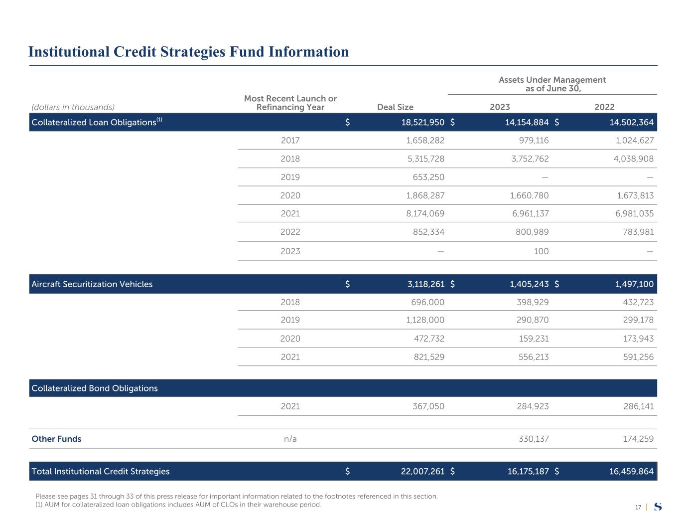 |17 Most Recent Launch or Refinancing Year Assets Under Management as of June 30, (dollars in thousands) Deal Size 2023 2022 Collateralized Loan Obligations(1) $ 18,521,950 $ 14,154,884 $ 14,502,364 2017 1,658,282 979,116 1,024,627 2018 5,315,728 3,752,762 4,038,908 2019 653,250 — — 2020 1,868,287 1,660,780 1,673,813 2021 8,174,069 6,961,137 6,981,035 2022 852,334 800,989 783,981 2023 — 100 — Aircraft Securitization Vehicles $ 3,118,261 $ 1,405,243 $ 1,497,100 2018 696,000 398,929 432,723 2019 1,128,000 290,870 299,178 2020 472,732 159,231 173,943 2021 821,529 556,213 591,256 Collateralized Bond Obligations 2021 367,050 284,923 286,141 Other Funds n/a 330,137 174,259 Total Institutional Credit Strategies $ 22,007,261 $ 16,175,187 $ 16,459,864 Please see pages 31 through 33 of this press release for important information related to the footnotes referenced in this section. (1) AUM for collateralized loan obligations includes AUM of CLOs in their warehouse period. Institutional Credit Strategies Fund Information