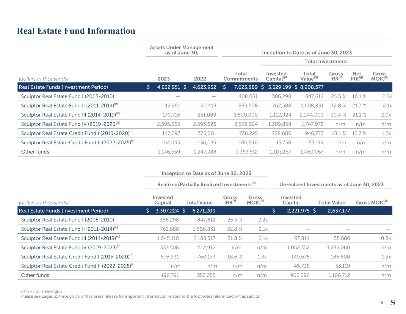 |18 (dollars in thousands) Assets Under Management as of June 30, Inception to Date as of June 30, 2023 Total Investments Total Commitments Invested Capital(p) Total Value(q) Gross IRR(f) Net IRR(g) Gross MOIC(r)2023 2022 Real Estate Funds (Investment Period) $ 4,232,951 $ 4,623,952 $ 7,623,889 $ 5,529,199 $ 8,908,377 Sculptor Real Estate Fund I (2005-2010) — — 408,081 386,298 847,612 25.5 % 16.1 % 2.2x Sculptor Real Estate Fund II (2011-2014)(n) 19,291 20,413 839,508 762,588 1,608,831 32.8 % 21.7 % 2.1x Sculptor Real Estate Fund III (2014-2019)(n) 170,716 251,089 1,500,000 1,112,924 2,244,003 30.4 % 21.1 % 2.0x Sculptor Real Estate Fund IV (2019-2023)(s) 2,595,055 2,593,626 2,596,024 1,389,858 1,747,972 n/m n/m n/m Sculptor Real Estate Credit Fund I (2015-2020)(n) 147,297 375,001 736,225 728,606 946,773 18.1 % 12.7 % 1.3x Sculptor Real Estate Credit Fund II (2022-2025)(s) 154,033 136,035 180,540 45,738 53,119 n/m n/m n/m Other funds 1,146,559 1,247,788 1,363,512 1,103,187 1,460,067 n/m n/m n/m Inception to Date as of June 30, 2023 (dollars in thousands) Realized/Partially Realized Investments(o) Unrealized Investments as of June 30, 2023 Invested Capital Total Value Gross IRR(f) Gross MOIC(r) Invested Capital Total Value Gross MOIC(r) Real Estate Funds (Investment Period) $ 3,307,224 $ 6,271,200 $ 2,221,975 $ 2,637,177 Sculptor Real Estate Fund I (2005-2010) 386,298 847,612 25.5 % 2.2x — — — Sculptor Real Estate Fund II (2011-2014)(n) 762,588 1,608,831 32.8 % 2.1x — — — Sculptor Real Estate Fund III (2014-2019)(n) 1,045,110 2,188,317 31.8 % 2.1x 67,814 55,686 0.8x Sculptor Real Estate Fund IV (2019-2023)(s) 337,506 512,912 n/m n/m 1,052,352 1,235,060 n/m Sculptor Real Estate Credit Fund I (2015-2020)(n) 578,931 760,173 18.6 % 1.3x 149,675 186,600 1.2x Sculptor Real Estate Credit Fund II (2022-2025)(s) n/m n/m n/m n/m 45,738 53,119 n/m Other funds 196,791 353,355 n/m n/m 906,396 1,106,712 n/m n/m - not meaningful Please see pages 31 through 33 of this press release for important information related to the footnotes referenced in this section. Real Estate Fund Information