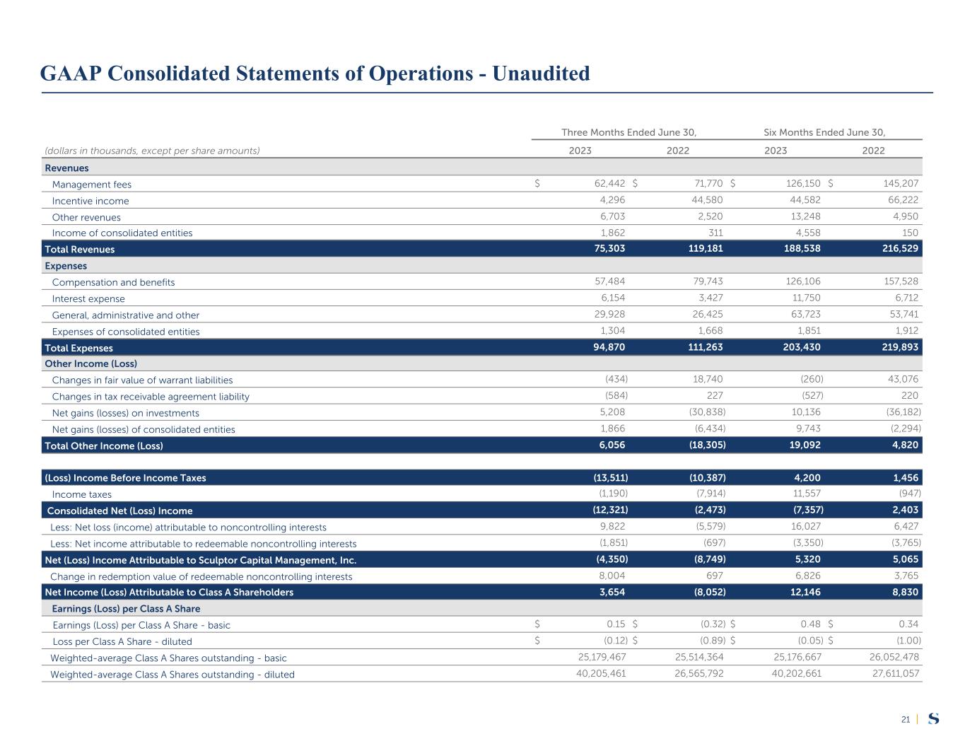 |21 Three Months Ended June 30, Six Months Ended June 30, (dollars in thousands, except per share amounts) 2023 2022 2023 2022 Revenues Management fees $ 62,442 $ 71,770 $ 126,150 $ 145,207 Incentive income 4,296 44,580 44,582 66,222 Other revenues 6,703 2,520 13,248 4,950 Income of consolidated entities 1,862 311 4,558 150 Total Revenues 75,303 119,181 188,538 216,529 Expenses Compensation and benefits 57,484 79,743 126,106 157,528 Interest expense 6,154 3,427 11,750 6,712 General, administrative and other 29,928 26,425 63,723 53,741 Expenses of consolidated entities 1,304 1,668 1,851 1,912 Total Expenses 94,870 111,263 203,430 219,893 Other Income (Loss) Changes in fair value of warrant liabilities (434) 18,740 (260) 43,076 Changes in tax receivable agreement liability (584) 227 (527) 220 Net gains (losses) on investments 5,208 (30,838) 10,136 (36,182) Net gains (losses) of consolidated entities 1,866 (6,434) 9,743 (2,294) Total Other Income (Loss) 6,056 (18,305) 19,092 4,820 (Loss) Income Before Income Taxes (13,511) (10,387) 4,200 1,456 Income taxes (1,190) (7,914) 11,557 (947) Consolidated Net (Loss) Income (12,321) (2,473) (7,357) 2,403 Less: Net loss (income) attributable to noncontrolling interests 9,822 (5,579) 16,027 6,427 Less: Net income attributable to redeemable noncontrolling interests (1,851) (697) (3,350) (3,765) Net (Loss) Income Attributable to Sculptor Capital Management, Inc. (4,350) (8,749) 5,320 5,065 Change in redemption value of redeemable noncontrolling interests 8,004 697 6,826 3,765 Net Income (Loss) Attributable to Class A Shareholders 3,654 (8,052) 12,146 8,830 Earnings (Loss) per Class A Share Earnings (Loss) per Class A Share - basic $ 0.15 $ (0.32) $ 0.48 $ 0.34 Loss per Class A Share - diluted $ (0.12) $ (0.89) $ (0.05) $ (1.00) Weighted-average Class A Shares outstanding - basic 25,179,467 25,514,364 25,176,667 26,052,478 Weighted-average Class A Shares outstanding - diluted 40,205,461 26,565,792 40,202,661 27,611,057 GAAP Consolidated Statements of Operations - Unaudited