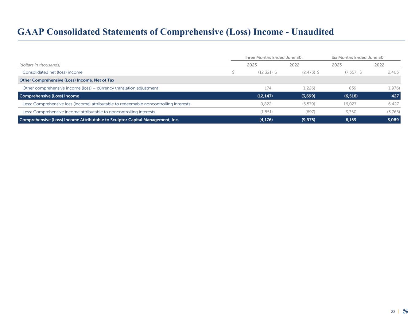 |22 Three Months Ended June 30, Six Months Ended June 30, (dollars in thousands) 2023 2022 2023 2022 Consolidated net (loss) income $ (12,321) $ (2,473) $ (7,357) $ 2,403 Other Comprehensive (Loss) Income, Net of Tax Other comprehensive income (loss) – currency translation adjustment 174 (1,226) 839 (1,976) Comprehensive (Loss) Income (12,147) (3,699) (6,518) 427 Less: Comprehensive loss (income) attributable to redeemable noncontrolling interests 9,822 (5,579) 16,027 6,427 Less: Comprehensive income attributable to noncontrolling interests (1,851) (697) (3,350) (3,765) Comprehensive (Loss) Income Attributable to Sculptor Capital Management, Inc. (4,176) (9,975) 6,159 3,089 GAAP Consolidated Statements of Comprehensive (Loss) Income - Unaudited