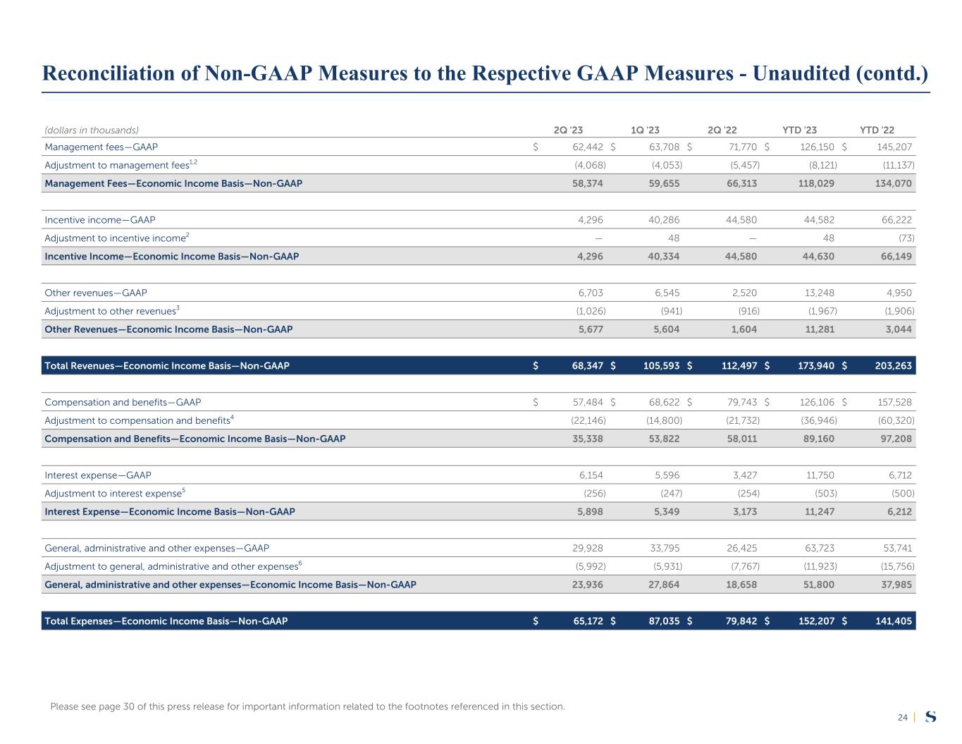 |24 (dollars in thousands) 2Q '23 1Q '23 2Q '22 YTD '23 YTD '22 Management fees—GAAP $ 62,442 $ 63,708 $ 71,770 $ 126,150 $ 145,207 Adjustment to management fees1,2 (4,068) (4,053) (5,457) (8,121) (11,137) Management Fees—Economic Income Basis—Non-GAAP 58,374 59,655 66,313 118,029 134,070 Incentive income—GAAP 4,296 40,286 44,580 44,582 66,222 Adjustment to incentive income2 — 48 — 48 (73) Incentive Income—Economic Income Basis—Non-GAAP 4,296 40,334 44,580 44,630 66,149 Other revenues—GAAP 6,703 6,545 2,520 13,248 4,950 Adjustment to other revenues3 (1,026) (941) (916) (1,967) (1,906) Other Revenues—Economic Income Basis—Non-GAAP 5,677 5,604 1,604 11,281 3,044 Total Revenues—Economic Income Basis—Non-GAAP $ 68,347 $ 105,593 $ 112,497 $ 173,940 $ 203,263 Compensation and benefits—GAAP $ 57,484 $ 68,622 $ 79,743 $ 126,106 $ 157,528 Adjustment to compensation and benefits4 (22,146) (14,800) (21,732) (36,946) (60,320) Compensation and Benefits—Economic Income Basis—Non-GAAP 35,338 53,822 58,011 89,160 97,208 Interest expense—GAAP 6,154 5,596 3,427 11,750 6,712 Adjustment to interest expense5 (256) (247) (254) (503) (500) Interest Expense—Economic Income Basis—Non-GAAP 5,898 5,349 3,173 11,247 6,212 General, administrative and other expenses—GAAP 29,928 33,795 26,425 63,723 53,741 Adjustment to general, administrative and other expenses6 (5,992) (5,931) (7,767) (11,923) (15,756) General, administrative and other expenses—Economic Income Basis—Non-GAAP 23,936 27,864 18,658 51,800 37,985 Total Expenses—Economic Income Basis—Non-GAAP $ 65,172 $ 87,035 $ 79,842 $ 152,207 $ 141,405 Reconciliation of Non-GAAP Measures to the Respective GAAP Measures - Unaudited (contd.) Please see page 30 of this press release for important information related to the footnotes referenced in this section.
