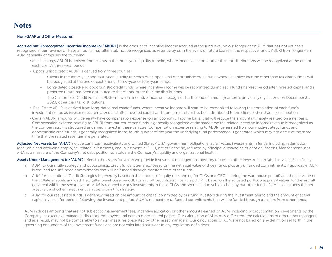 |27 Non-GAAP and Other Measures Accrued but Unrecognized Incentive Income (or "ABURI") is the amount of incentive income accrued at the fund level on our longer-term AUM that has not yet been recognized in our revenues. These amounts may ultimately not be recognized as revenue by us in the event of future losses in the respective funds. ABURI from longer-term AUM generally comprises the following: ▪Multi-strategy ABURI is derived from clients in the three-year liquidity tranche, where incentive income other than tax distributions will be recognized at the end of each client’s three-year period ▪ Opportunistic credit ABURI is derived from three sources: – Clients in the three-year and four-year liquidity tranches of an open-end opportunistic credit fund, where incentive income other than tax distributions will be recognized at the end of each client’s three-year or four-year period. – Long-dated closed-end opportunistic credit funds, where incentive income will be recognized during each fund’s harvest period after invested capital and a preferred return has been distributed to the clients, other than tax distributions. – The Customized Credit Focused Platform, where incentive income is recognized at the end of a multi-year term; previously crystallized on December 31, 2020, other than tax distributions. ▪ Real Estate ABURI is derived from long-dated real estate funds, where incentive income will start to be recognized following the completion of each fund’s investment period as investments are realized and after invested capital and a preferred return has been distributed to the clients other than tax distributions. ▪Certain ABURI amounts will generally have compensation expense (on an Economic Income basis) that will reduce the amount ultimately realized on a net basis. Compensation expense relating to ABURI from our real estate funds is generally recognized at the same time the related incentive income revenue is recognized as the compensation is structured as carried interest in these vehicles. Compensation expense relating to ABURI generated from our multi-strategy funds and opportunistic credit funds is generally recognized in the fourth quarter of the year the underlying fund performance is generated which may not occur at the same time that the related revenues are generated. Adjusted Net Assets (or "ANA") include cash, cash equivalents and United States ("U.S.") government obligations, at fair value, investments in funds, including redemption receivable and excluding employee-related investments, and investment in CLOs, net of financing, reduced by principal outstanding of debt obligations. Management uses ANA as a measure of the Company’s net debt position to evaluate the Company’s liquidity and organizational health. Assets Under Management (or "AUM") refers to the assets for which we provide investment management, advisory or certain other investment-related services. Specifically: a. AUM for our multi-strategy and opportunistic credit funds is generally based on the net asset value of those funds plus any unfunded commitments, if applicable. AUM is reduced for unfunded commitments that will be funded through transfers from other funds. b. AUM for Institutional Credit Strategies is generally based on the amount of equity outstanding for CLOs and CBOs (during the warehouse period) and the par value of the collateral assets and cash held (after warehouse period). For aircraft securitization vehicles, AUM is based on the adjusted portfolio appraisal values for the aircraft collateral within the securitization. AUM is reduced for any investments in these CLOs and securitization vehicles held by our other funds. AUM also includes the net asset value of other investment vehicles within this strategy. c. AUM for our real estate funds is generally based on the amount of capital committed by our fund investors during the investment period and the amount of actual capital invested for periods following the investment period. AUM is reduced for unfunded commitments that will be funded through transfers from other funds. AUM includes amounts that are not subject to management fees, incentive allocation or other amounts earned on AUM, including without limitation, investments by the Company, its executive managing directors, employees and certain other related parties. Our calculation of AUM may differ from the calculations of other asset managers, and as a result, may not be comparable to similar measures presented by other asset managers. Our calculations of AUM are not based on any definition set forth in the governing documents of the investment funds and are not calculated pursuant to any regulatory definitions. Notes