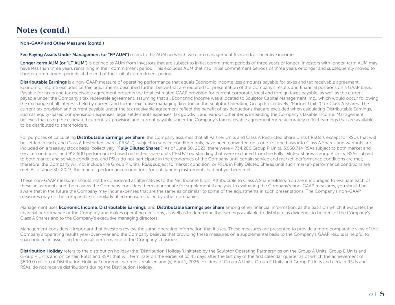|28 Notes (contd.) Non-GAAP and Other Measures (contd.) Fee Paying Assets Under Management (or "FP AUM") refers to the AUM on which we earn management fees and/or incentive income. Longer-term AUM (or "LT AUM") is defined as AUM from investors that are subject to initial commitment periods of three years or longer. Investors with longer-term AUM may have less than three years remaining in their commitment period. This excludes AUM that had initial commitment periods of three years or longer and subsequently moved to shorter commitment periods at the end of their initial commitment period. Distributable Earnings is a non-GAAP measure of operating performance that equals Economic Income less amounts payable for taxes and tax receivable agreement. Economic Income excludes certain adjustments described further below that are required for presentation of the Company's results and financial positions on a GAAP basis. Payable for taxes and tax receivable agreement presents the total estimated GAAP provision for current corporate, local and foreign taxes payable, as well as the current payable under the Company’s tax receivable agreement, assuming that all Economic Income was allocated to Sculptor Capital Management, Inc., which would occur following the exchange of all interests held by current and former executive managing directors in the Sculptor Operating Group (collectively, "Partner Units") for Class A Shares. The current tax provision and current payable under the tax receivable agreement reflect the benefit of tax deductions that are excluded when calculating Distributable Earnings, such as equity-based compensation expenses, legal settlements expenses, tax goodwill and various other items impacting the Company’s taxable income. Management believes that using the estimated current tax provision and current payable under the Company’s tax receivable agreement more accurately reflect earnings that are available to be distributed to shareholders. For purposes of calculating Distributable Earnings per Share, the Company assumes that all Partner Units and Class A Restricted Share Units ("RSUs"), except for RSUs that will be settled in cash, and Class A Restricted shares (“RSAs”), subject to service condition only, have been converted on a one-to-one basis into Class A Shares and warrants are included on a treasury stock basis (collectively, "Fully Diluted Shares"). As of June 30, 2023, there were 4,734,286 Group P Units, 3,550,714 RSAs subject to both market and service conditions, and 912,500 performance-based restricted share units ("PSUs") outstanding that were excluded from the Fully Diluted Shares. Group P Units, RSAs subject to both market and service conditions, and PSUs do not participate in the economics of the Company until certain service and market-performance conditions are met; therefore, the Company will not include the Group P Units, RSAs subject to market condition, or PSUs in Fully Diluted Shares until such market-performance conditions are met. As of June 30, 2023, the market-performance conditions for outstanding instruments had not yet been met. These non-GAAP measures should not be considered as alternatives to the Net Income (Loss) Attributable to Class A Shareholders. You are encouraged to evaluate each of these adjustments and the reasons the Company considers them appropriate for supplemental analysis. In evaluating the Company's non-GAAP measures, you should be aware that in the future the Company may incur expenses that are the same as or similar to some of the adjustments in such presentations. The Company's non-GAAP measures may not be comparable to similarly titled measures used by other companies. Management uses Economic Income, Distributable Earnings, and Distributable Earnings per Share among other financial information, as the basis on which it evaluates the financial performance of the Company and makes operating decisions, as well as to determine the earnings available to distribute as dividends to holders of the Company's Class A Shares and to the Company's executive managing directors. Management considers it important that investors review the same operating information that it uses. These measures are presented to provide a more comparable view of the Company's operating results year-over-year and the Company believes that providing these measures on a supplemental basis to the Company's GAAP results is helpful to shareholders in assessing the overall performance of the Company's business. Distribution Holiday refers to the distribution holiday (the “Distribution Holiday”) initiated by the Sculptor Operating Partnerships on the Group A Units, Group E Units and Group P Units and on certain RSUs and RSAs that will terminate on the earlier of (x) 45 days after the last day of the first calendar quarter as of which the achievement of $600.0 million of Distribution Holiday Economic Income is realized and (y) April 1, 2026. Holders of Group A Units, Group E Units and Group P Units and certain RSUs and RSAs, do not receive distributions during the Distribution Holiday.