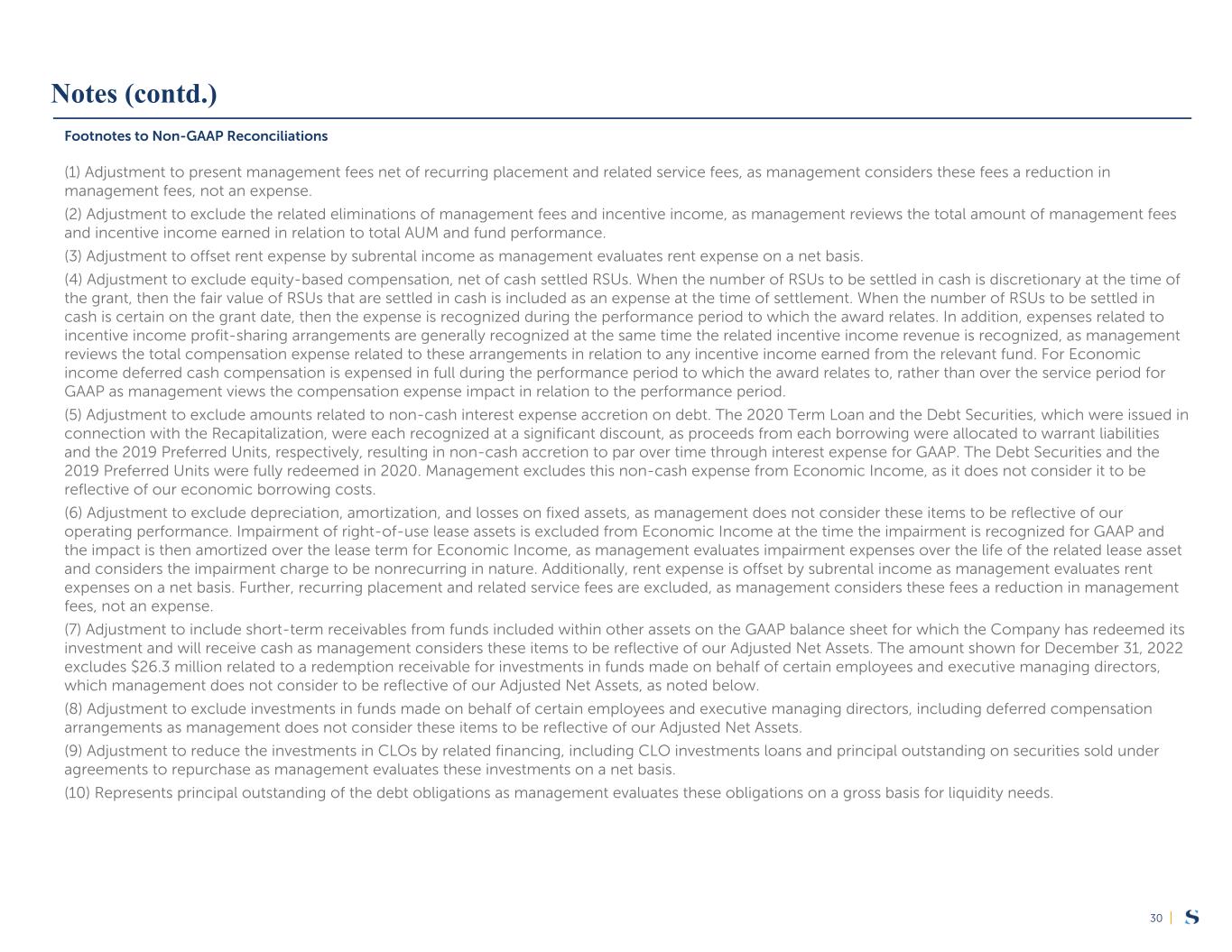 |30 Footnotes to Non-GAAP Reconciliations (1) Adjustment to present management fees net of recurring placement and related service fees, as management considers these fees a reduction in management fees, not an expense. (2) Adjustment to exclude the related eliminations of management fees and incentive income, as management reviews the total amount of management fees and incentive income earned in relation to total AUM and fund performance. (3) Adjustment to offset rent expense by subrental income as management evaluates rent expense on a net basis. (4) Adjustment to exclude equity-based compensation, net of cash settled RSUs. When the number of RSUs to be settled in cash is discretionary at the time of the grant, then the fair value of RSUs that are settled in cash is included as an expense at the time of settlement. When the number of RSUs to be settled in cash is certain on the grant date, then the expense is recognized during the performance period to which the award relates. In addition, expenses related to incentive income profit-sharing arrangements are generally recognized at the same time the related incentive income revenue is recognized, as management reviews the total compensation expense related to these arrangements in relation to any incentive income earned from the relevant fund. For Economic income deferred cash compensation is expensed in full during the performance period to which the award relates to, rather than over the service period for GAAP as management views the compensation expense impact in relation to the performance period. (5) Adjustment to exclude amounts related to non-cash interest expense accretion on debt. The 2020 Term Loan and the Debt Securities, which were issued in connection with the Recapitalization, were each recognized at a significant discount, as proceeds from each borrowing were allocated to warrant liabilities and the 2019 Preferred Units, respectively, resulting in non-cash accretion to par over time through interest expense for GAAP. The Debt Securities and the 2019 Preferred Units were fully redeemed in 2020. Management excludes this non-cash expense from Economic Income, as it does not consider it to be reflective of our economic borrowing costs. (6) Adjustment to exclude depreciation, amortization, and losses on fixed assets, as management does not consider these items to be reflective of our operating performance. Impairment of right-of-use lease assets is excluded from Economic Income at the time the impairment is recognized for GAAP and the impact is then amortized over the lease term for Economic Income, as management evaluates impairment expenses over the life of the related lease asset and considers the impairment charge to be nonrecurring in nature. Additionally, rent expense is offset by subrental income as management evaluates rent expenses on a net basis. Further, recurring placement and related service fees are excluded, as management considers these fees a reduction in management fees, not an expense. (7) Adjustment to include short-term receivables from funds included within other assets on the GAAP balance sheet for which the Company has redeemed its investment and will receive cash as management considers these items to be reflective of our Adjusted Net Assets. The amount shown for December 31, 2022 excludes $26.3 million related to a redemption receivable for investments in funds made on behalf of certain employees and executive managing directors, which management does not consider to be reflective of our Adjusted Net Assets, as noted below. (8) Adjustment to exclude investments in funds made on behalf of certain employees and executive managing directors, including deferred compensation arrangements as management does not consider these items to be reflective of our Adjusted Net Assets. (9) Adjustment to reduce the investments in CLOs by related financing, including CLO investments loans and principal outstanding on securities sold under agreements to repurchase as management evaluates these investments on a net basis. (10) Represents principal outstanding of the debt obligations as management evaluates these obligations on a gross basis for liquidity needs. Notes (contd.)