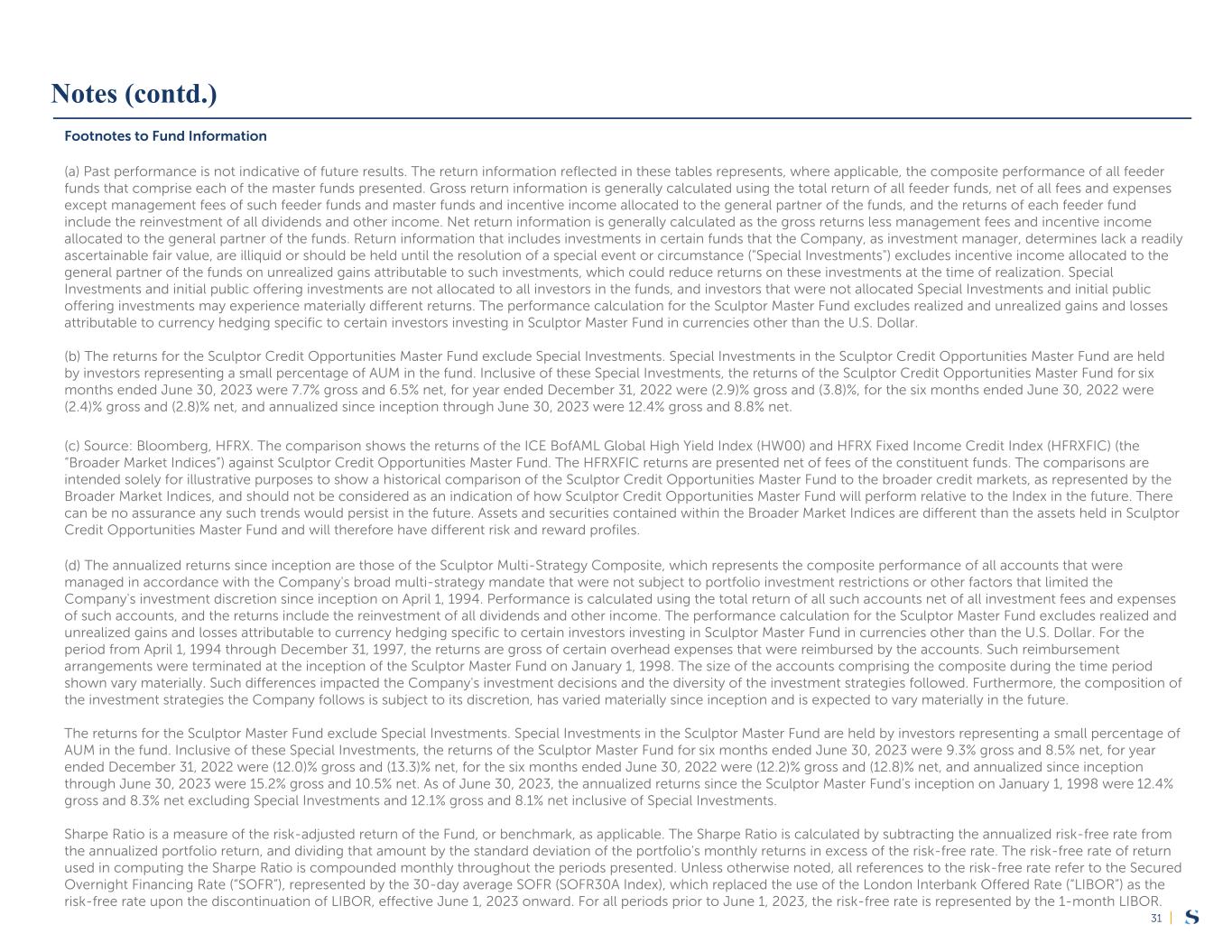 |31 Footnotes to Fund Information (a) Past performance is not indicative of future results. The return information reflected in these tables represents, where applicable, the composite performance of all feeder funds that comprise each of the master funds presented. Gross return information is generally calculated using the total return of all feeder funds, net of all fees and expenses except management fees of such feeder funds and master funds and incentive income allocated to the general partner of the funds, and the returns of each feeder fund include the reinvestment of all dividends and other income. Net return information is generally calculated as the gross returns less management fees and incentive income allocated to the general partner of the funds. Return information that includes investments in certain funds that the Company, as investment manager, determines lack a readily ascertainable fair value, are illiquid or should be held until the resolution of a special event or circumstance ("Special Investments") excludes incentive income allocated to the general partner of the funds on unrealized gains attributable to such investments, which could reduce returns on these investments at the time of realization. Special Investments and initial public offering investments are not allocated to all investors in the funds, and investors that were not allocated Special Investments and initial public offering investments may experience materially different returns. The performance calculation for the Sculptor Master Fund excludes realized and unrealized gains and losses attributable to currency hedging specific to certain investors investing in Sculptor Master Fund in currencies other than the U.S. Dollar. (b) The returns for the Sculptor Credit Opportunities Master Fund exclude Special Investments. Special Investments in the Sculptor Credit Opportunities Master Fund are held by investors representing a small percentage of AUM in the fund. Inclusive of these Special Investments, the returns of the Sculptor Credit Opportunities Master Fund for six months ended June 30, 2023 were 7.7% gross and 6.5% net, for year ended December 31, 2022 were (2.9)% gross and (3.8)%, for the six months ended June 30, 2022 were (2.4)% gross and (2.8)% net, and annualized since inception through June 30, 2023 were 12.4% gross and 8.8% net. (c) Source: Bloomberg, HFRX. The comparison shows the returns of the ICE BofAML Global High Yield Index (HW00) and HFRX Fixed Income Credit Index (HFRXFIC) (the “Broader Market Indices”) against Sculptor Credit Opportunities Master Fund. The HFRXFIC returns are presented net of fees of the constituent funds. The comparisons are intended solely for illustrative purposes to show a historical comparison of the Sculptor Credit Opportunities Master Fund to the broader credit markets, as represented by the Broader Market Indices, and should not be considered as an indication of how Sculptor Credit Opportunities Master Fund will perform relative to the Index in the future. There can be no assurance any such trends would persist in the future. Assets and securities contained within the Broader Market Indices are different than the assets held in Sculptor Credit Opportunities Master Fund and will therefore have different risk and reward profiles. (d) The annualized returns since inception are those of the Sculptor Multi-Strategy Composite, which represents the composite performance of all accounts that were managed in accordance with the Company's broad multi-strategy mandate that were not subject to portfolio investment restrictions or other factors that limited the Company's investment discretion since inception on April 1, 1994. Performance is calculated using the total return of all such accounts net of all investment fees and expenses of such accounts, and the returns include the reinvestment of all dividends and other income. The performance calculation for the Sculptor Master Fund excludes realized and unrealized gains and losses attributable to currency hedging specific to certain investors investing in Sculptor Master Fund in currencies other than the U.S. Dollar. For the period from April 1, 1994 through December 31, 1997, the returns are gross of certain overhead expenses that were reimbursed by the accounts. Such reimbursement arrangements were terminated at the inception of the Sculptor Master Fund on January 1, 1998. The size of the accounts comprising the composite during the time period shown vary materially. Such differences impacted the Company's investment decisions and the diversity of the investment strategies followed. Furthermore, the composition of the investment strategies the Company follows is subject to its discretion, has varied materially since inception and is expected to vary materially in the future. The returns for the Sculptor Master Fund exclude Special Investments. Special Investments in the Sculptor Master Fund are held by investors representing a small percentage of AUM in the fund. Inclusive of these Special Investments, the returns of the Sculptor Master Fund for six months ended June 30, 2023 were 9.3% gross and 8.5% net, for year ended December 31, 2022 were (12.0)% gross and (13.3)% net, for the six months ended June 30, 2022 were (12.2)% gross and (12.8)% net, and annualized since inception through June 30, 2023 were 15.2% gross and 10.5% net. As of June 30, 2023, the annualized returns since the Sculptor Master Fund’s inception on January 1, 1998 were 12.4% gross and 8.3% net excluding Special Investments and 12.1% gross and 8.1% net inclusive of Special Investments. Sharpe Ratio is a measure of the risk-adjusted return of the Fund, or benchmark, as applicable. The Sharpe Ratio is calculated by subtracting the annualized risk-free rate from the annualized portfolio return, and dividing that amount by the standard deviation of the portfolio's monthly returns in excess of the risk-free rate. The risk-free rate of return used in comp
