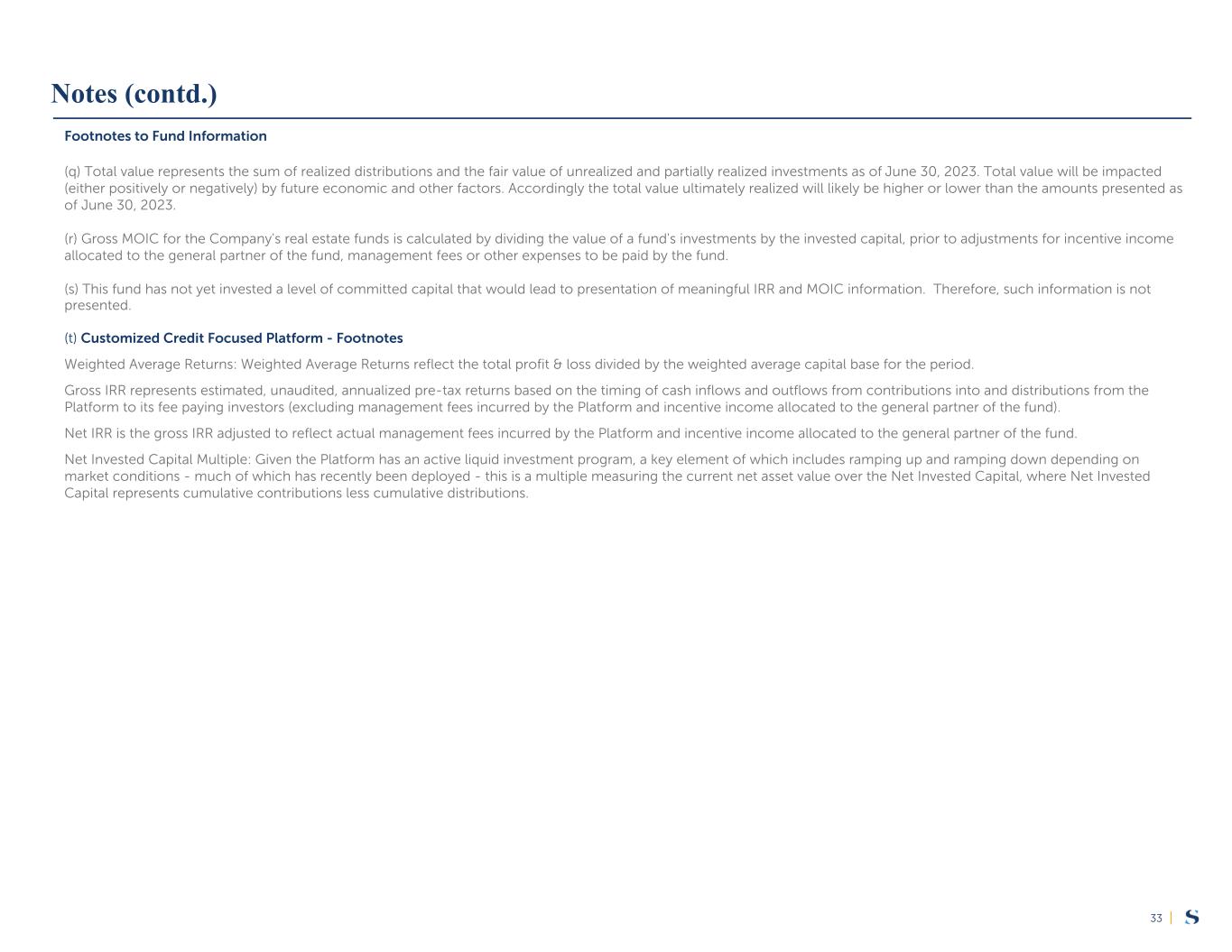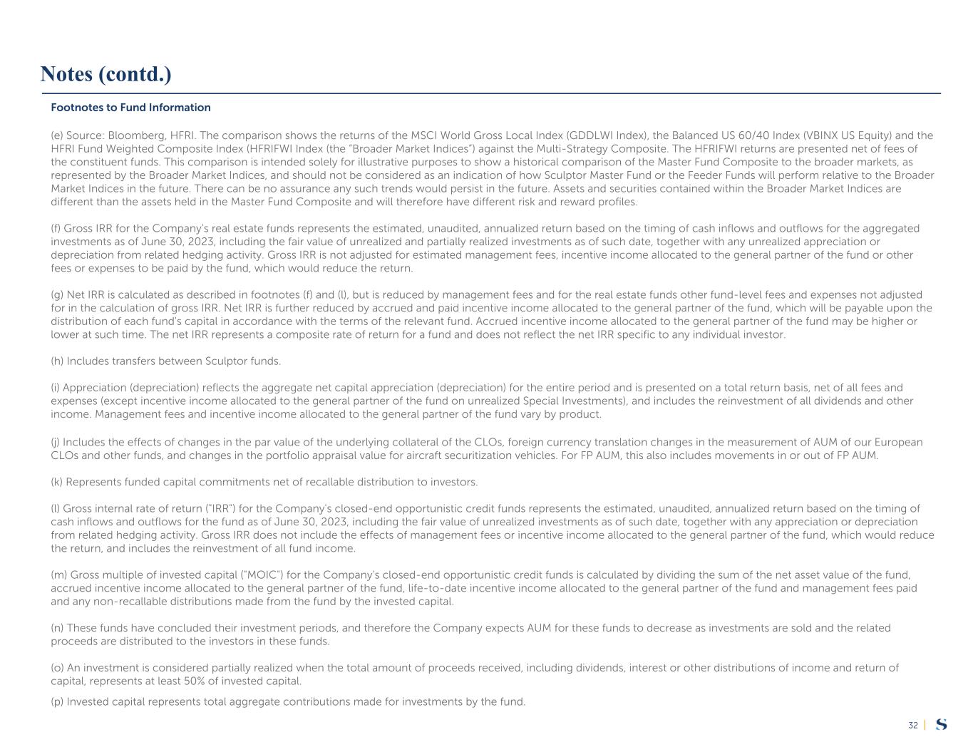 |32 Footnotes to Fund Information (e) Source: Bloomberg, HFRI. The comparison shows the returns of the MSCI World Gross Local Index (GDDLWI Index), the Balanced US 60/40 Index (VBINX US Equity) and the HFRI Fund Weighted Composite Index (HFRIFWI Index (the “Broader Market Indices”) against the Multi-Strategy Composite. The HFRIFWI returns are presented net of fees of the constituent funds. This comparison is intended solely for illustrative purposes to show a historical comparison of the Master Fund Composite to the broader markets, as represented by the Broader Market Indices, and should not be considered as an indication of how Sculptor Master Fund or the Feeder Funds will perform relative to the Broader Market Indices in the future. There can be no assurance any such trends would persist in the future. Assets and securities contained within the Broader Market Indices are different than the assets held in the Master Fund Composite and will therefore have different risk and reward profiles. (f) Gross IRR for the Company's real estate funds represents the estimated, unaudited, annualized return based on the timing of cash inflows and outflows for the aggregated investments as of June 30, 2023, including the fair value of unrealized and partially realized investments as of such date, together with any unrealized appreciation or depreciation from related hedging activity. Gross IRR is not adjusted for estimated management fees, incentive income allocated to the general partner of the fund or other fees or expenses to be paid by the fund, which would reduce the return. (g) Net IRR is calculated as described in footnotes (f) and (l), but is reduced by management fees and for the real estate funds other fund-level fees and expenses not adjusted for in the calculation of gross IRR. Net IRR is further reduced by accrued and paid incentive income allocated to the general partner of the fund, which will be payable upon the distribution of each fund's capital in accordance with the terms of the relevant fund. Accrued incentive income allocated to the general partner of the fund may be higher or lower at such time. The net IRR represents a composite rate of return for a fund and does not reflect the net IRR specific to any individual investor. (h) Includes transfers between Sculptor funds. (i) Appreciation (depreciation) reflects the aggregate net capital appreciation (depreciation) for the entire period and is presented on a total return basis, net of all fees and expenses (except incentive income allocated to the general partner of the fund on unrealized Special Investments), and includes the reinvestment of all dividends and other income. Management fees and incentive income allocated to the general partner of the fund vary by product. (j) Includes the effects of changes in the par value of the underlying collateral of the CLOs, foreign currency translation changes in the measurement of AUM of our European CLOs and other funds, and changes in the portfolio appraisal value for aircraft securitization vehicles. For FP AUM, this also includes movements in or out of FP AUM. (k) Represents funded capital commitments net of recallable distribution to investors. (l) Gross internal rate of return ("IRR") for the Company's closed-end opportunistic credit funds represents the estimated, unaudited, annualized return based on the timing of cash inflows and outflows for the fund as of June 30, 2023, including the fair value of unrealized investments as of such date, together with any appreciation or depreciation from related hedging activity. Gross IRR does not include the effects of management fees or incentive income allocated to the general partner of the fund, which would reduce the return, and includes the reinvestment of all fund income. (m) Gross multiple of invested capital ("MOIC") for the Company's closed-end opportunistic credit funds is calculated by dividing the sum of the net asset value of the fund, accrued incentive income allocated to the general partner of the fund, life-to-date incentive income allocated to the general partner of the fund and management fees paid and any non-recallable distributions made from the fund by the invested capital. (n) These funds have concluded their investment periods, and therefore the Company expects AUM for these funds to decrease as investments are sold and the related proceeds are distributed to the investors in these funds. (o) An investment is considered partially realized when the total amount of proceeds received, including dividends, interest or other distributions of income and return of capital, represents at least 50% of invested capital. (p) Invested capital represents total aggregate contributions made for investments by the fund. Notes (contd.)