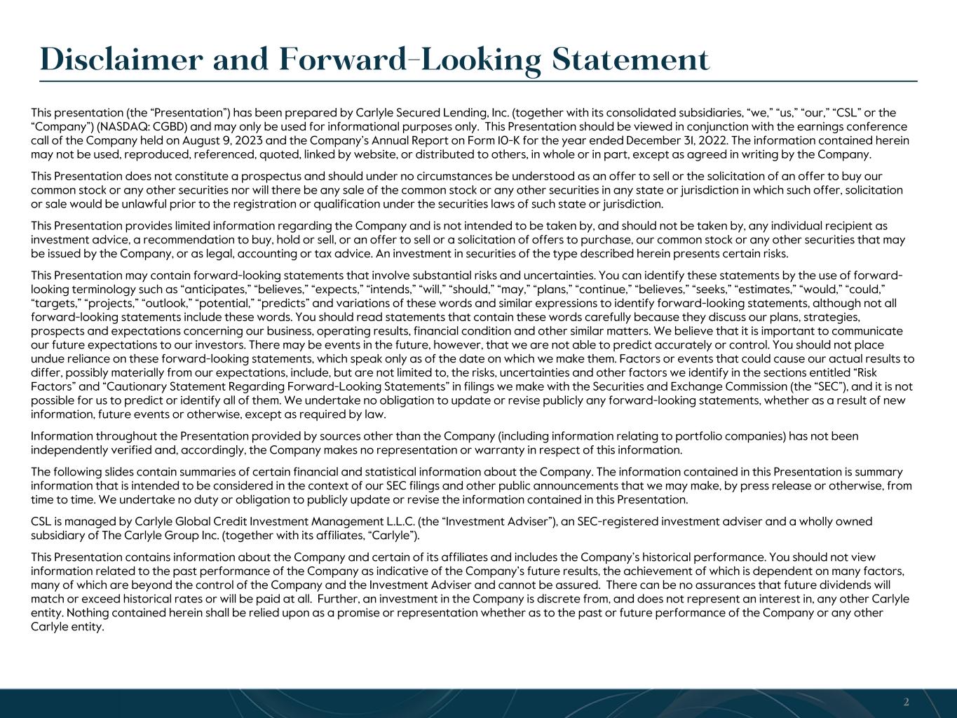 Disclaimer and Forward-Looking Statement This presentation (the “Presentation”) has been prepared by Carlyle Secured Lending, Inc. (together with its consolidated subsidiaries, “we,” “us,” “our,” “CSL” or the “Company”) (NASDAQ: CGBD) and may only be used for informational purposes only. This Presentation should be viewed in conjunction with the earnings conference call of the Company held on August 9, 2023 and the Company’s Annual Report on Form 10-K for the year ended December 31, 2022. The information contained herein may not be used, reproduced, referenced, quoted, linked by website, or distributed to others, in whole or in part, except as agreed in writing by the Company. This Presentation does not constitute a prospectus and should under no circumstances be understood as an offer to sell or the solicitation of an offer to buy our common stock or any other securities nor will there be any sale of the common stock or any other securities in any state or jurisdiction in which such offer, solicitation or sale would be unlawful prior to the registration or qualification under the securities laws of such state or jurisdiction. This Presentation provides limited information regarding the Company and is not intended to be taken by, and should not be taken by, any individual recipient as investment advice, a recommendation to buy, hold or sell, or an offer to sell or a solicitation of offers to purchase, our common stock or any other securities that may be issued by the Company, or as legal, accounting or tax advice. An investment in securities of the type described herein presents certain risks. This Presentation may contain forward-looking statements that involve substantial risks and uncertainties. You can identify these statements by the use of forward- looking terminology such as “anticipates,” “believes,” “expects,” “intends,” “will,” “should,” “may,” “plans,” “continue,” “believes,” “seeks,” “estimates,” “would,” “could,” “targets,” “projects,” “outlook,” “potential,” “predicts” and variations of these words and similar expressions to identify forward-looking statements, although not all forward-looking statements include these words. You should read statements that contain these words carefully because they discuss our plans, strategies, prospects and expectations concerning our business, operating results, financial condition and other similar matters. We believe that it is important to communicate our future expectations to our investors. There may be events in the future, however, that we are not able to predict accurately or control. You should not place undue reliance on these forward-looking statements, which speak only as of the date on which we make them. Factors or events that could cause our actual results to differ, possibly materially from our expectations, include, but are not limited to, the risks, uncertainties and other factors we identify in the sections entitled “Risk Factors” and “Cautionary Statement Regarding Forward-Looking Statements” in filings we make with the Securities and Exchange Commission (the “SEC”), and it is not possible for us to predict or identify all of them. We undertake no obligation to update or revise publicly any forward-looking statements, whether as a result of new information, future events or otherwise, except as required by law. Information throughout the Presentation provided by sources other than the Company (including information relating to portfolio companies) has not been independently verified and, accordingly, the Company makes no representation or warranty in respect of this information. The following slides contain summaries of certain financial and statistical information about the Company. The information contained in this Presentation is summary information that is intended to be considered in the context of our SEC filings and other public announcements that we may make, by press release or otherwise, from time to time. We undertake no duty or obligation to publicly update or revise the information contained in this Presentation. CSL is managed by Carlyle Global Credit Investment Management L.L.C. (the “Investment Adviser”), an SEC-registered investment adviser and a wholly owned subsidiary of The Carlyle Group Inc. (together with its affiliates, “Carlyle”). This Presentation contains information about the Company and certain of its affiliates and includes the Company’s historical performance. You should not view information related to the past performance of the Company as indicative of the Company’s future results, the achievement of which is dependent on many factors, many of which are beyond the control of the Company and the Investment Adviser and cannot be assured. There can be no assurances that future dividends will match or exceed historical rates or will be paid at all. Further, an investment in the Company is discrete from, and does not represent an interest in, any other Carlyle entity. Nothing contained herein shall be relied upon as a promise or representation whether as to the past or future performance of the Company or any other Carlyle entity. 2