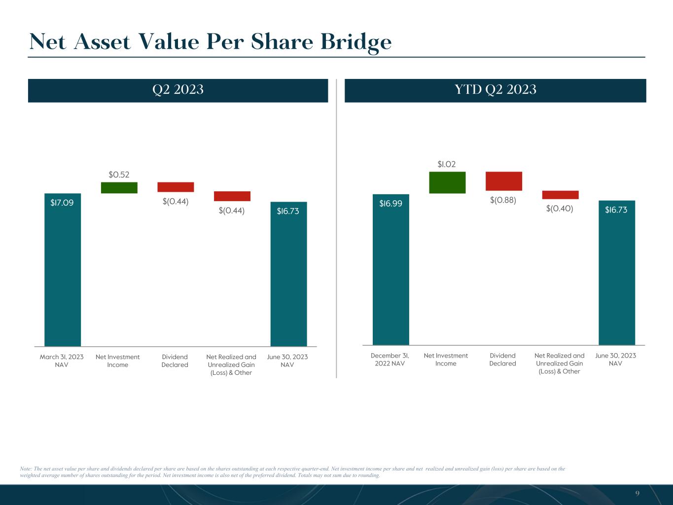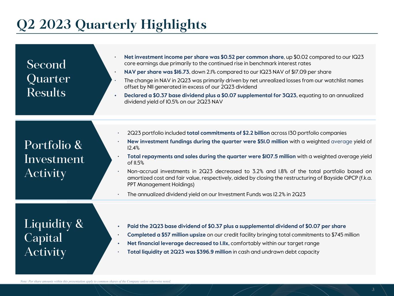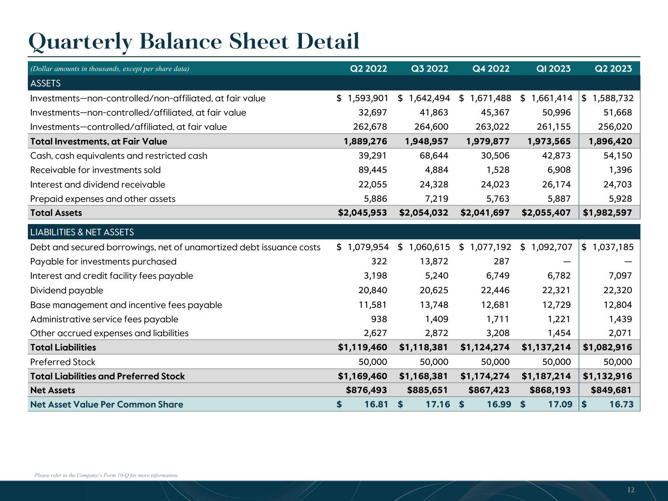 Quarterly Balance Sheet Detail Please refer to the Company’s Form 10-Q for more information. (Dollar amounts in thousands, except per share data) Q2 2022 Q3 2022 Q4 2022 Q1 2023 Q2 2023 ASSETS Investments—non-controlled/non-affiliated, at fair value $ 1,593,901 $ 1,642,494 $ 1,671,488 $ 1,661,414 $ 1,588,732 Investments—non-controlled/affiliated, at fair value 32,697 41,863 45,367 50,996 51,668 Investments—controlled/affiliated, at fair value 262,678 264,600 263,022 261,155 256,020 Total Investments, at Fair Value 1,889,276 1,948,957 1,979,877 1,973,565 1,896,420 Cash, cash equivalents and restricted cash 39,291 68,644 30,506 42,873 54,150 Receivable for investments sold 89,445 4,884 1,528 6,908 1,396 Interest and dividend receivable 22,055 24,328 24,023 26,174 24,703 Prepaid expenses and other assets 5,886 7,219 5,763 5,887 5,928 Total Assets $2,045,953 $2,054,032 $2,041,697 $2,055,407 $1,982,597 LIABILITIES & NET ASSETS Debt and secured borrowings, net of unamortized debt issuance costs $ 1,079,954 $ 1,060,615 $ 1,077,192 $ 1,092,707 $ 1,037,185 Payable for investments purchased 322 13,872 287 — — Interest and credit facility fees payable 3,198 5,240 6,749 6,782 7,097 Dividend payable 20,840 20,625 22,446 22,321 22,320 Base management and incentive fees payable 11,581 13,748 12,681 12,729 12,804 Administrative service fees payable 938 1,409 1,711 1,221 1,439 Other accrued expenses and liabilities 2,627 2,872 3,208 1,454 2,071 Total Liabilities $1,119,460 $1,118,381 $1,124,274 $1,137,214 $1,082,916 Preferred Stock 50,000 50,000 50,000 50,000 50,000 Total Liabilities and Preferred Stock $1,169,460 $1,168,381 $1,174,274 $1,187,214 $1,132,916 Net Assets $876,493 $885,651 $867,423 $868,193 $849,681 Net Asset Value Per Common Share $ 16.81 $ 17.16 $ 16.99 $ 17.09 $ 16.73 12