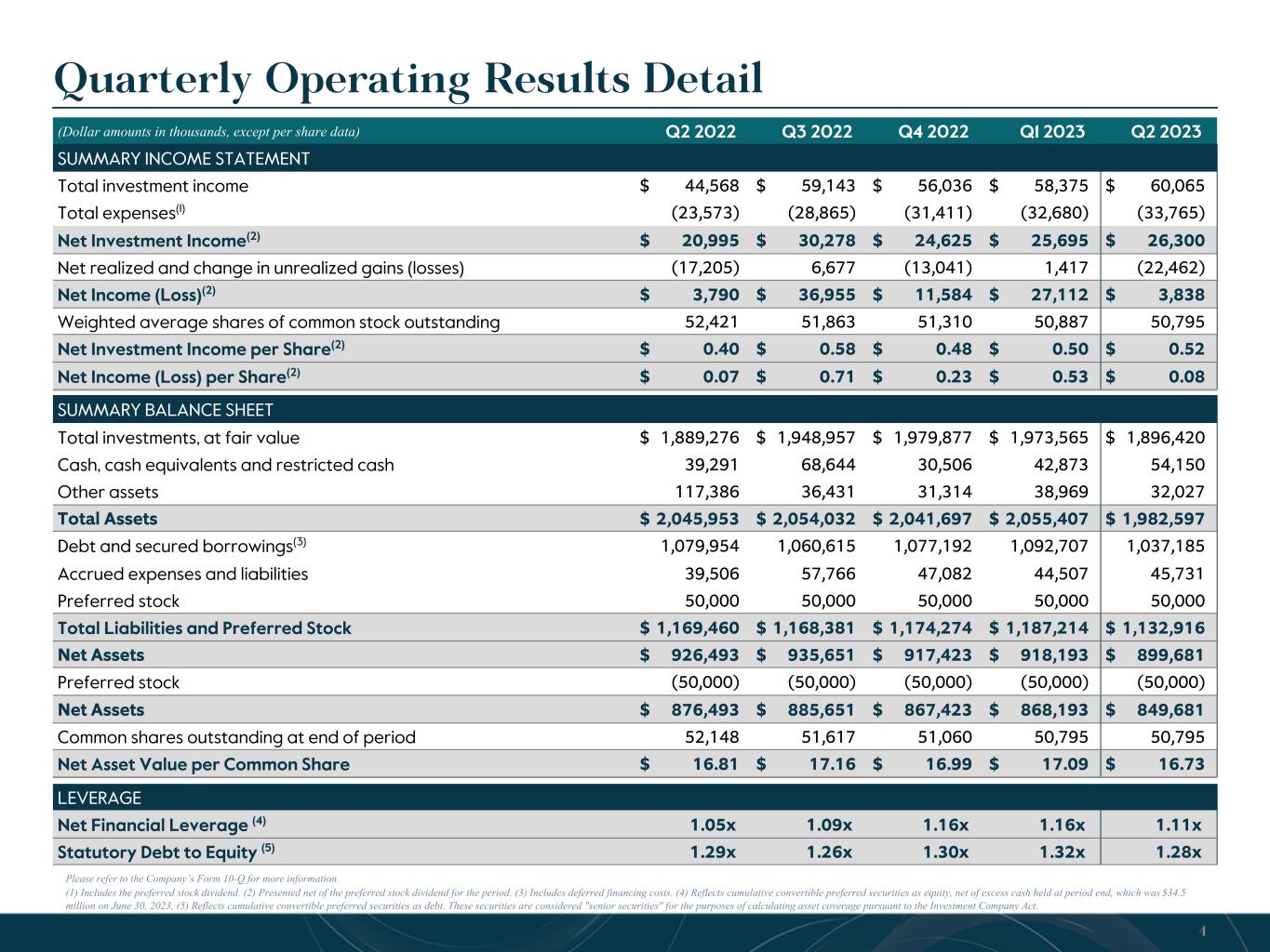 Quarterly Operating Results Detail Please refer to the Company’s Form 10-Q for more information. (1) Includes the preferred stock dividend. (2) Presented net of the preferred stock dividend for the period. (3) Includes deferred financing costs. (4) Reflects cumulative convertible preferred securities as equity, net of excess cash held at period end, which was $34.5 million on June 30, 2023. (5) Reflects cumulative convertible preferred securities as debt. These securities are considered "senior securities" for the purposes of calculating asset coverage pursuant to the Investment Company Act. (Dollar amounts in thousands, except per share data) Q2 2022 Q3 2022 Q4 2022 Q1 2023 Q2 2023 SUMMARY INCOME STATEMENT Total investment income $ 44,568 $ 59,143 $ 56,036 $ 58,375 $ 60,065 Total expenses(1) (23,573) (28,865) (31,411) (32,680) (33,765) Net Investment Income(2) $ 20,995 $ 30,278 $ 24,625 $ 25,695 $ 26,300 Net realized and change in unrealized gains (losses) (17,205) 6,677 (13,041) 1,417 (22,462) Net Income (Loss)(2) $ 3,790 $ 36,955 $ 11,584 $ 27,112 $ 3,838 Weighted average shares of common stock outstanding 52,421 51,863 51,310 50,887 50,795 Net Investment Income per Share(2) $ 0.40 $ 0.58 $ 0.48 $ 0.50 $ 0.52 Net Income (Loss) per Share(2) $ 0.07 $ 0.71 $ 0.23 $ 0.53 $ 0.08 SUMMARY BALANCE SHEET Total investments, at fair value $ 1,889,276 $ 1,948,957 $ 1,979,877 $ 1,973,565 $ 1,896,420 Cash, cash equivalents and restricted cash 39,291 68,644 30,506 42,873 54,150 Other assets 117,386 36,431 31,314 38,969 32,027 Total Assets $ 2,045,953 $ 2,054,032 $ 2,041,697 $ 2,055,407 $ 1,982,597 Debt and secured borrowings(3) 1,079,954 1,060,615 1,077,192 1,092,707 1,037,185 Accrued expenses and liabilities 39,506 57,766 47,082 44,507 45,731 Preferred stock 50,000 50,000 50,000 50,000 50,000 Total Liabilities and Preferred Stock $ 1,169,460 $ 1,168,381 $ 1,174,274 $ 1,187,214 $ 1,132,916 Net Assets $ 926,493 $ 935,651 $ 917,423 $ 918,193 $ 899,681 Preferred stock (50,000) (50,000) (50,000) (50,000) (50,000) Net Assets $ 876,493 $ 885,651 $ 867,423 $ 868,193 $ 849,681 Common shares outstanding at end of period 52,148 51,617 51,060 50,795 50,795 Net Asset Value per Common Share $ 16.81 $ 17.16 $ 16.99 $ 17.09 $ 16.73 LEVERAGE Net Financial Leverage (4) 1.05x 1.09x 1.16x 1.16x 1.11x Statutory Debt to Equity (5) 1.29x 1.26x 1.30x 1.32x 1.28x 4