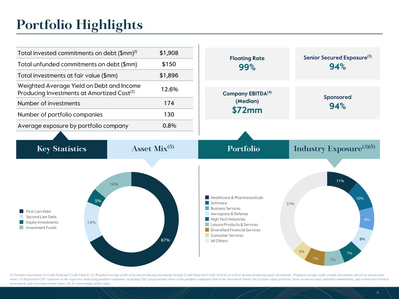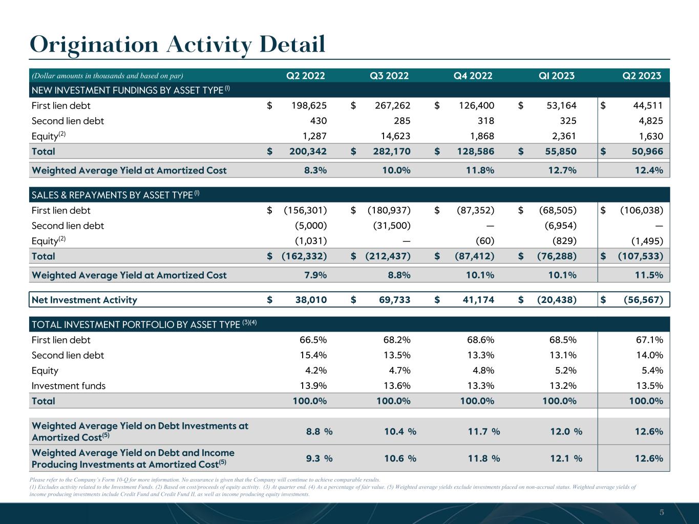 Please refer to the Company’s Form 10-Q for more information. No assurance is given that the Company will continue to achieve comparable results. (1) Excludes activity related to the Investment Funds. (2) Based on cost/proceeds of equity activity. (3) At quarter end. (4) As a percentage of fair value. (5) Weighted average yields exclude investments placed on non-accrual status. Weighted average yields of income producing investments include Credit Fund and Credit Fund II, as well as income producing equity investments. Origination Activity Detail (Dollar amounts in thousands and based on par) Q2 2022 Q3 2022 Q4 2022 Q1 2023 Q2 2023 NEW INVESTMENT FUNDINGS BY ASSET TYPE (1) First lien debt $ 198,625 $ 267,262 $ 126,400 $ 53,164 $ 44,511 Second lien debt 430 285 318 325 4,825 Equity(2) 1,287 14,623 1,868 2,361 1,630 Total $ 200,342 $ 282,170 $ 128,586 $ 55,850 $ 50,966 Weighted Average Yield at Amortized Cost 8.3 % 10.0 % 11.8 % 12.7 % 12.4 % SALES & REPAYMENTS BY ASSET TYPE (1) First lien debt $ (156,301) $ (180,937) $ (87,352) $ (68,505) $ (106,038) Second lien debt (5,000) (31,500) — (6,954) — Equity(2) (1,031) — (60) (829) (1,495) Total $ (162,332) $ (212,437) $ (87,412) $ (76,288) $ (107,533) Weighted Average Yield at Amortized Cost 7.9 % 8.8 % 10.1 % 10.1 % 11.5 % Net Investment Activity $ 38,010 $ 69,733 $ 41,174 $ (20,438) $ (56,567) TOTAL INVESTMENT PORTFOLIO BY ASSET TYPE (3)(4) First lien debt 66.5 % 68.2 % 68.6 % 68.5 % 67.1 % Second lien debt 15.4 % 13.5 % 13.3 % 13.1 % 14.0 % Equity 4.2 % 4.7 % 4.8 % 5.2 % 5.4 % Investment funds 13.9 % 13.6 % 13.3 % 13.2 % 13.5 % Total 100.0 % 100.0 % 100.0 % 100.0 % 100.0 % Weighted Average Yield on Debt Investments at Amortized Cost(5) 8.8 % 10.4 % 11.7 % 12.0 % 12.6 % Weighted Average Yield on Debt and Income Producing Investments at Amortized Cost(5) 9.3 % 10.6 % 11.8 % 12.1 % 12.6 % 5