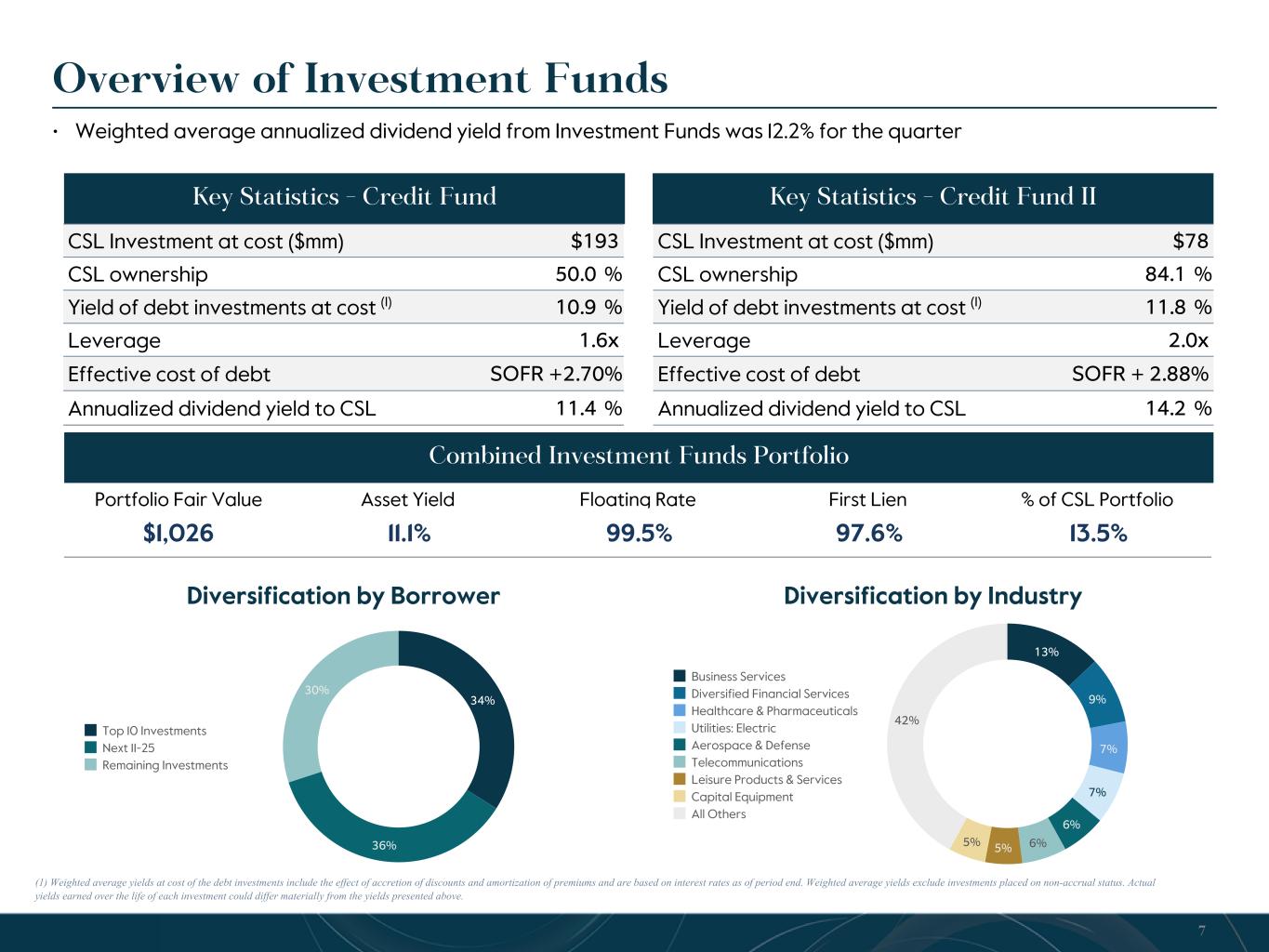67% 14% 5% 14% First Lien Debt Second Lien Debt Equity Investments Investment Funds 11% 10% 8% 8% 7% 7%7% 5% 37% Healthcare & Pharmaceuticals Software Business Services Aerospace & Defense High Tech Industries Leisure Products & Services Diversified Financial Services Consumer Services All Others Portfolio Highlights (1) Includes investments in Credit Fund and Credit Fund II. (2) Weighted average yields of income producing investments include Credit Fund and Credit Fund II, as well as income producing equity investments. Weighted average yields exclude investments placed on non-accrual status. (3) Represents CSL's exposure to the respective underlying portfolio companies, including CSL's proportionate share of the portfolio companies held in the Investment Funds. (4) Excludes equity positions, loans on non-accrual, unfunded commitments, and certain asset-backed, asset-based, and recurring revenue loans. (5) As a percentage of fair value. Total invested commitments on debt ($mm)(1) $1,908 Total unfunded commitments on debt ($mm) $150 Total investments at fair value ($mm) $1,896 Weighted Average Yield on Debt and Income Producing Investments at Amortized Cost(2) 12.6% Number of investments 174 Number of portfolio companies 130 Average exposure by portfolio company 0.8% 6 Key Statistics Asset Mix(5) Portfolio Industry Exposure(3)(5) Floating Rate 99% Sponsored 94% Company EBITDA(4) (Median) $72mm Floating Rate Covenanted Median EBITDA Origination LTV % $ Senior Secured Exposure(3) 94% %